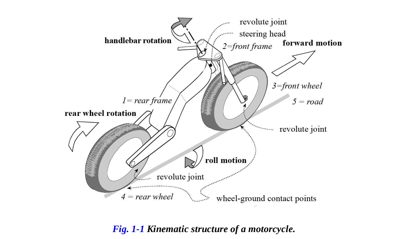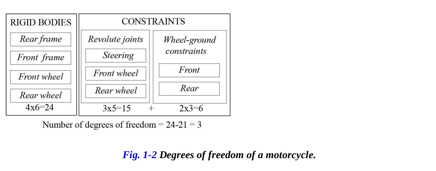 つまり、モーターサイクルの自由度の数は、3であり、これは、3つの回転ジョイントによって拘束される15の自由度と、2つの車輪-地面接触点によって除去される6つの自由度が、4つの剛体の24の自由度から減算される必要があるためです(図1-2)。