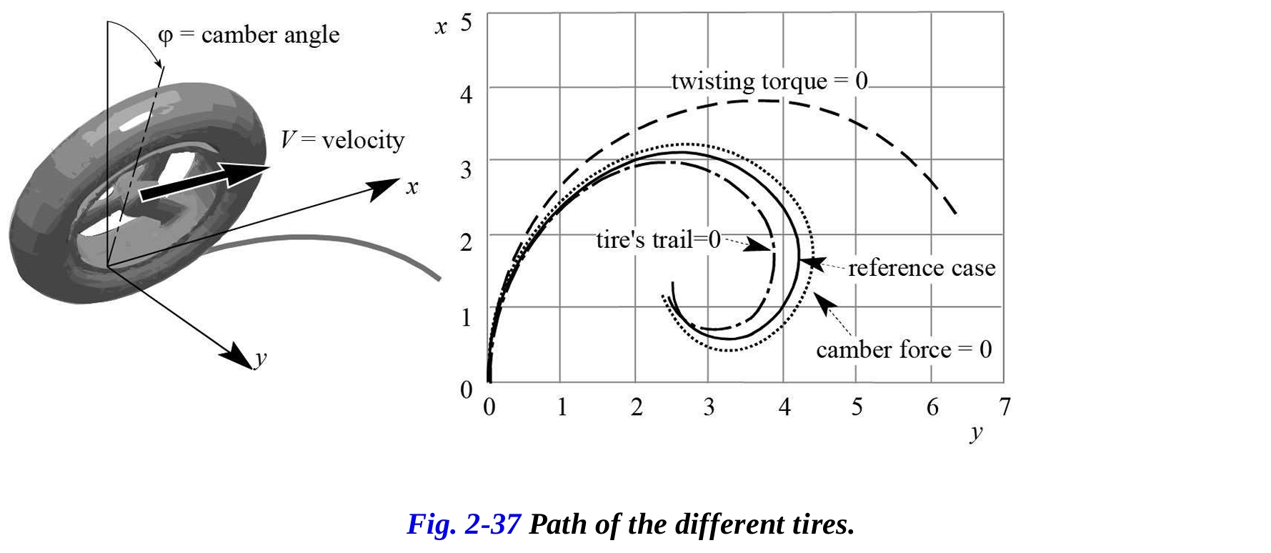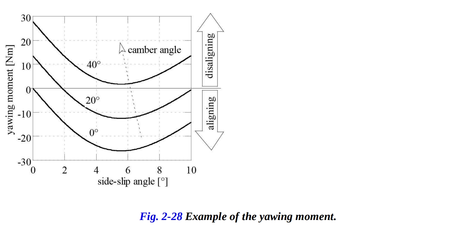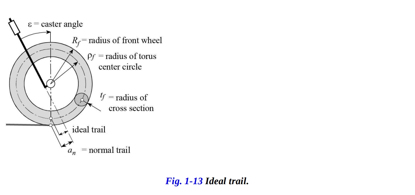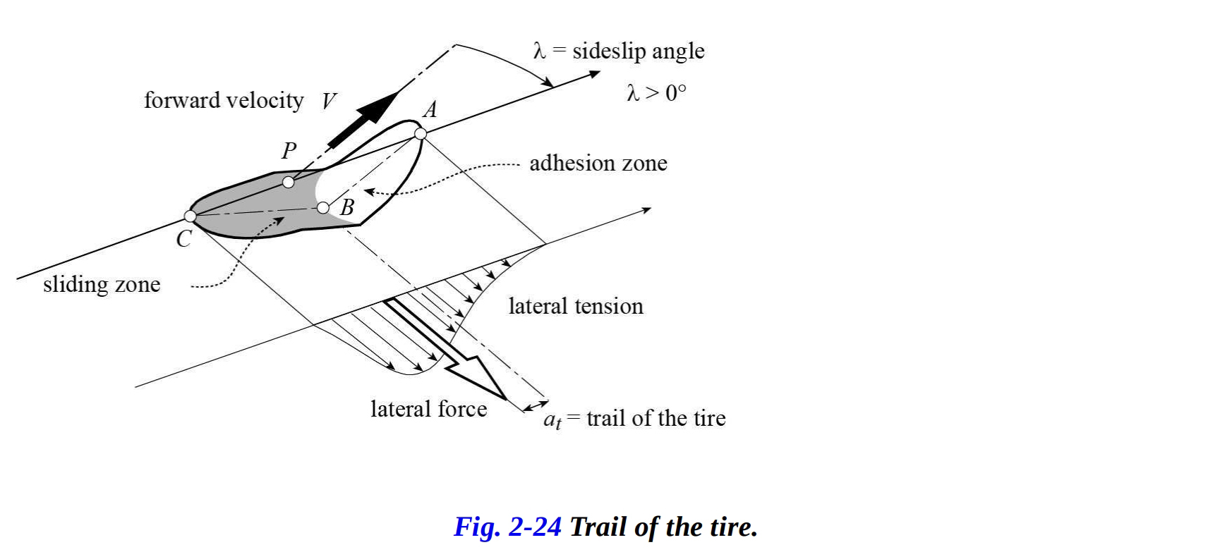 したがって、前輪に摩擦力 が作用します。 は滑り速度の方向に平行ですが、逆の向きです(図1-4を参照)。トレイルが正であるため、摩擦力 は前輪を正対させるモーメントを生成します。このモーメントは、法線トレイルの値に比例します。