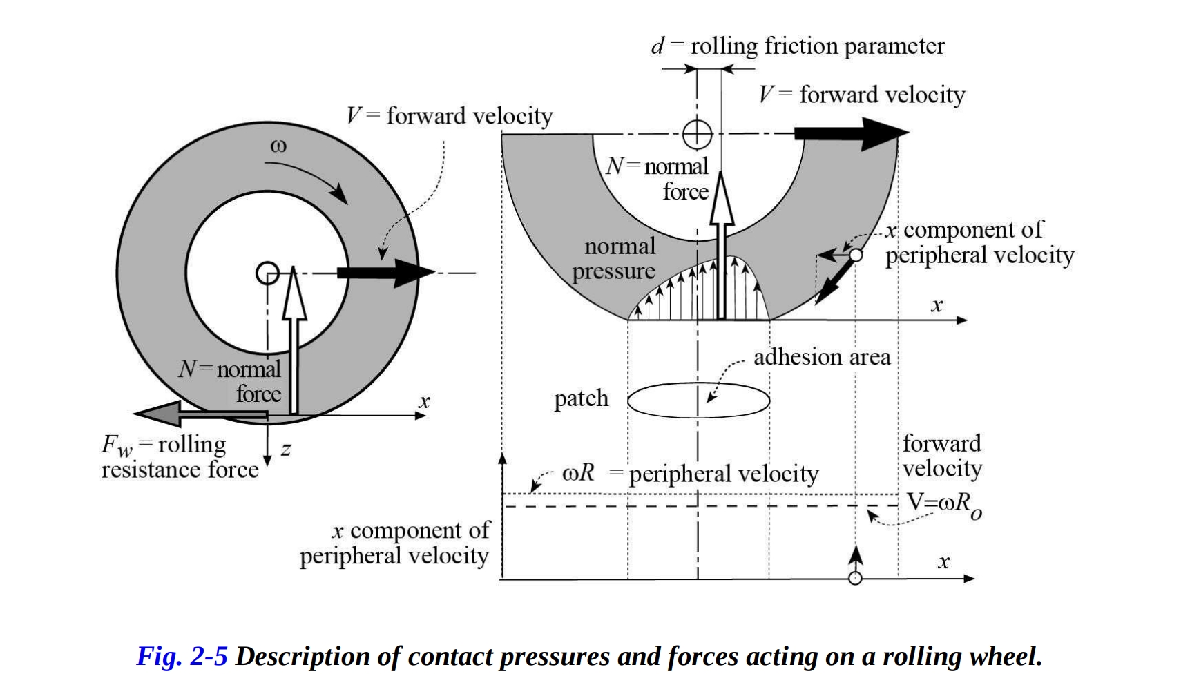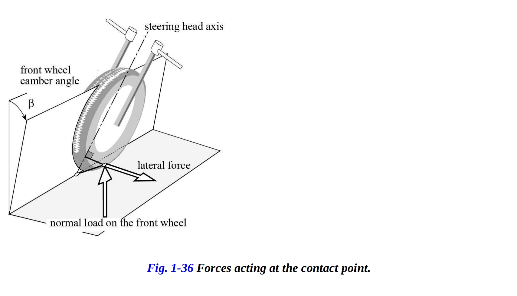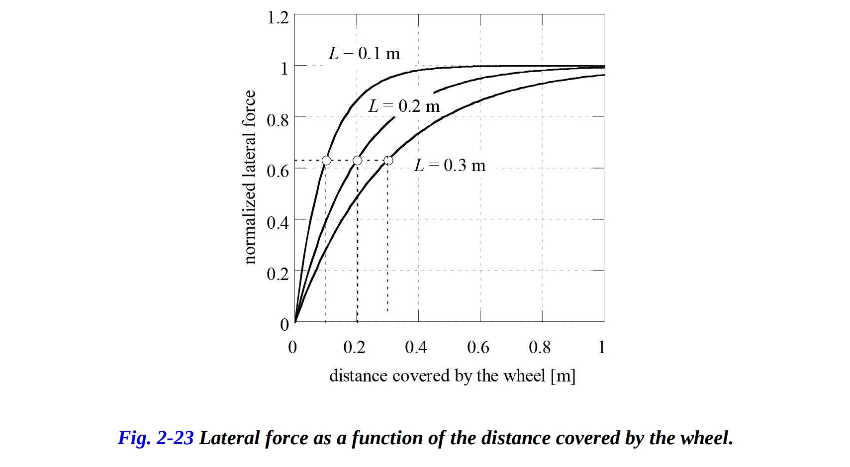 したがって、前輪に摩擦力 が作用します。 は滑り速度の方向に平行ですが、逆の向きです(図1-4を参照)。トレイルが正であるため、摩擦力 は前輪を正対させるモーメントを生成します。このモーメントは、法線トレイルの値に比例します。