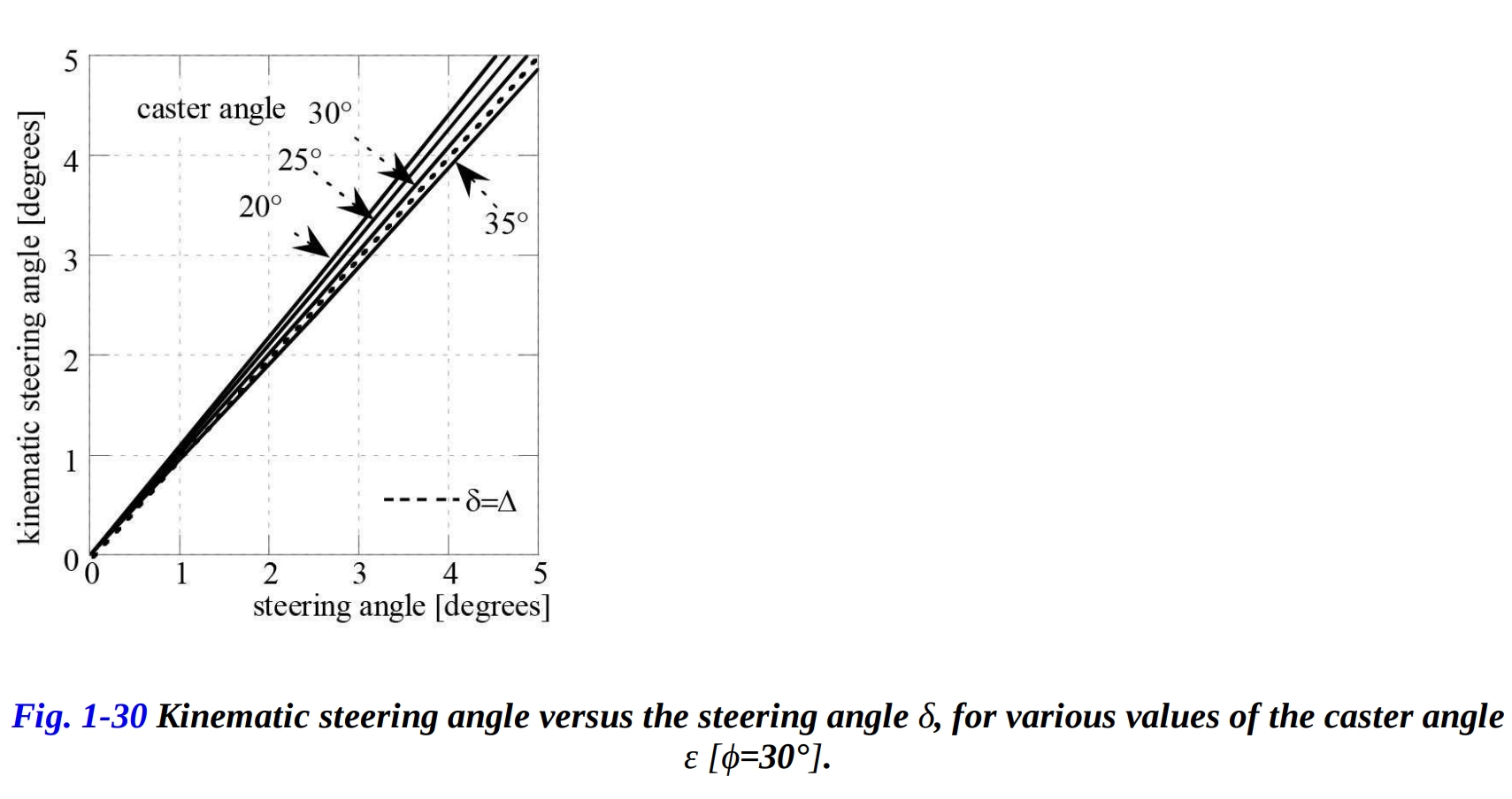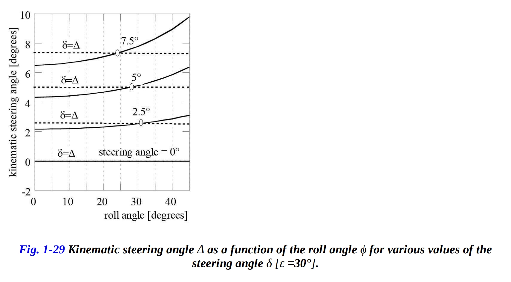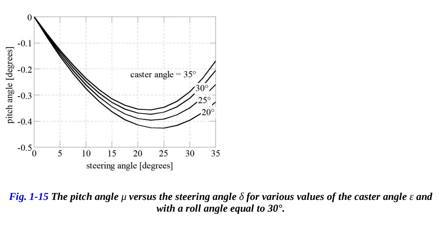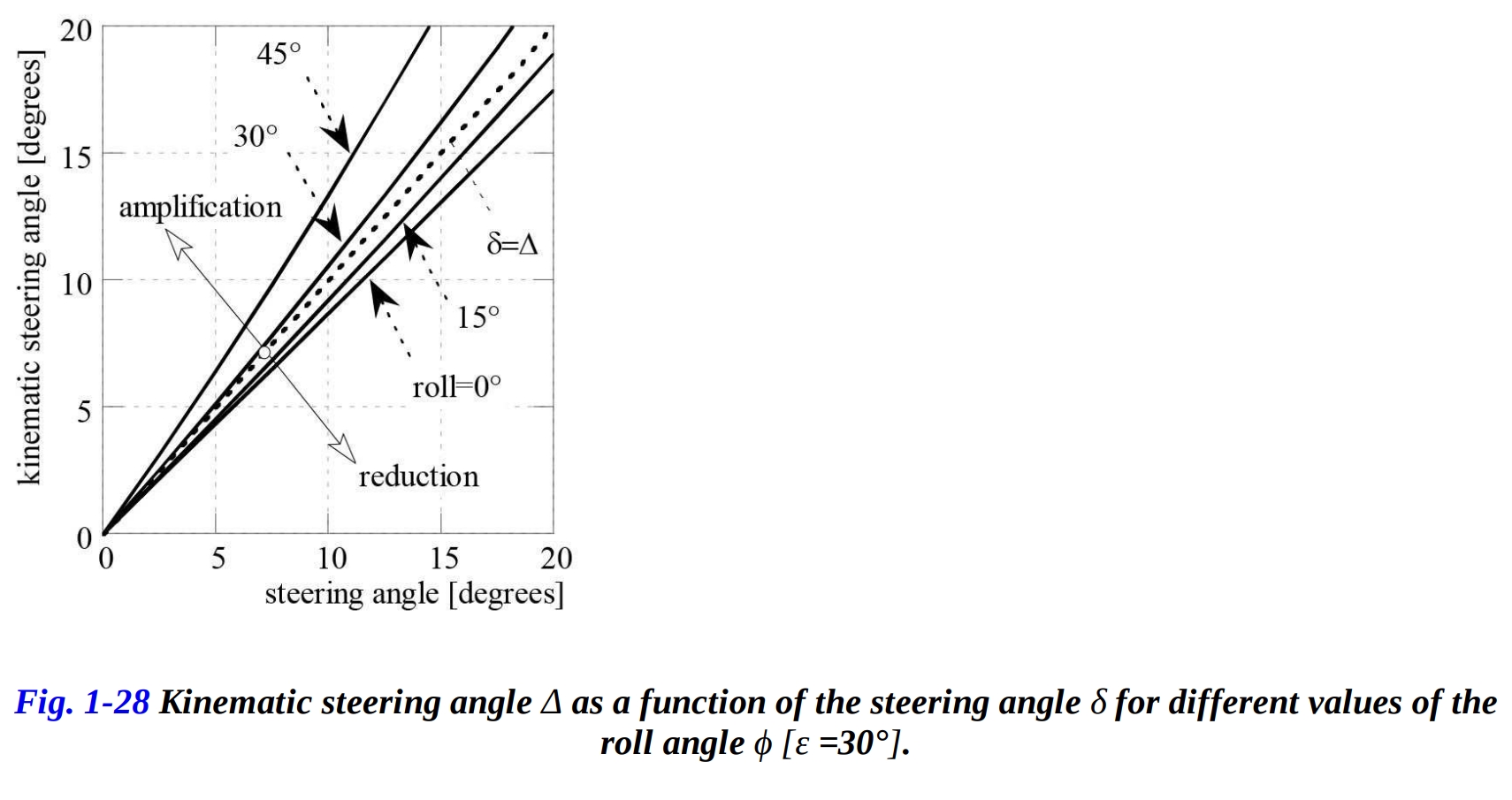 キャスター角ε、ステアリング角δ、前輪のキャンバー角β、運動学的ステアリング角Δ(回転角δを道路平面上に射影した角度)、および角度αは、以下の三角関数の方程式を通じて関連付けられます。