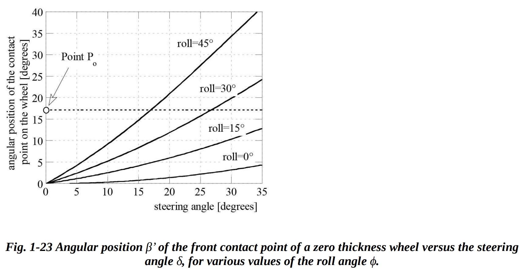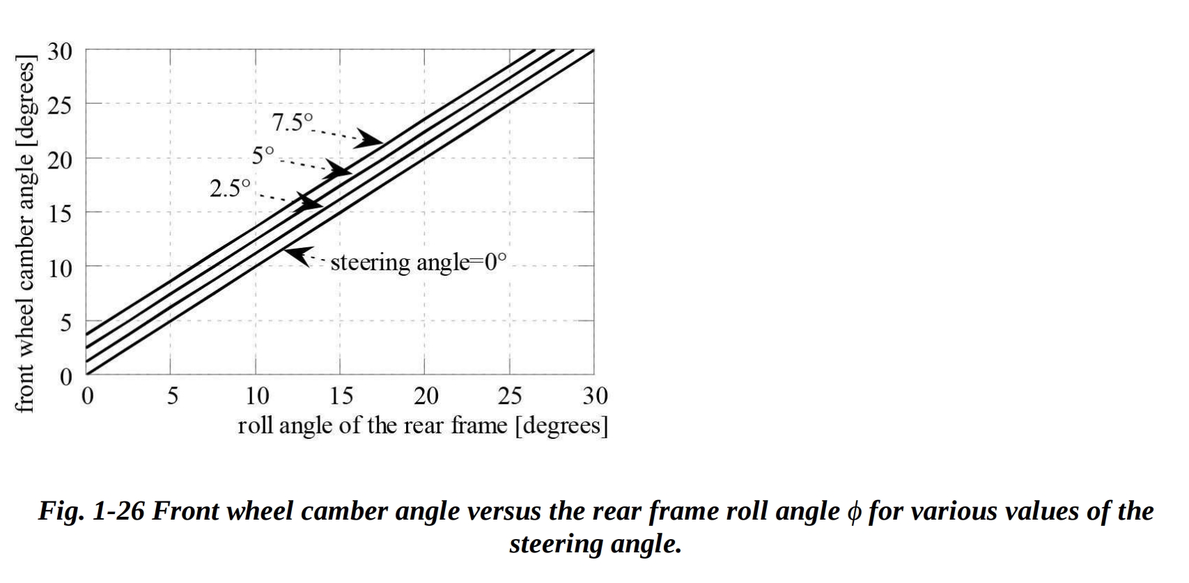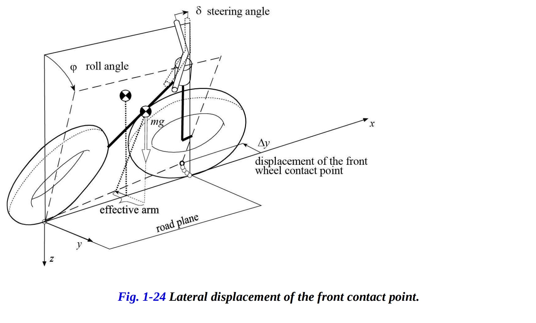 平衡状態において、遠心力と重力の合力は、タイヤの接地点を結ぶ線を通過します。この線は、タイヤがゼロの厚さで操舵角が非常に小さい場合、バイクの平面内にあります。実際には、ゼロでない操舵角が与えられると、前輪の接地点は後部フレームのx軸に対して横方向にずれるので、タイヤの接地点を結ぶ線は後部フレームの平面内には含まれません。