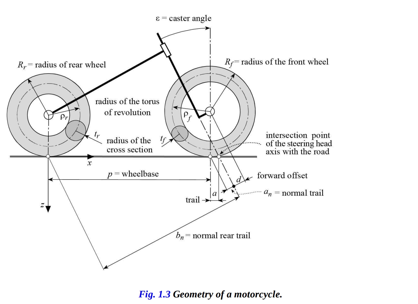 これらのパラメータは、ライダーが感じるモーターサイクルの操縦性を定義する上で重要です。ただし、これらの間に強い相互作用があるため、単独の幾何学的パラメータの効果を独立して調べることは実用的ではありません。以下では、これらのパラメータがモーターサイクルの運動学的および動的挙動にどのように影響するかについて考察します。