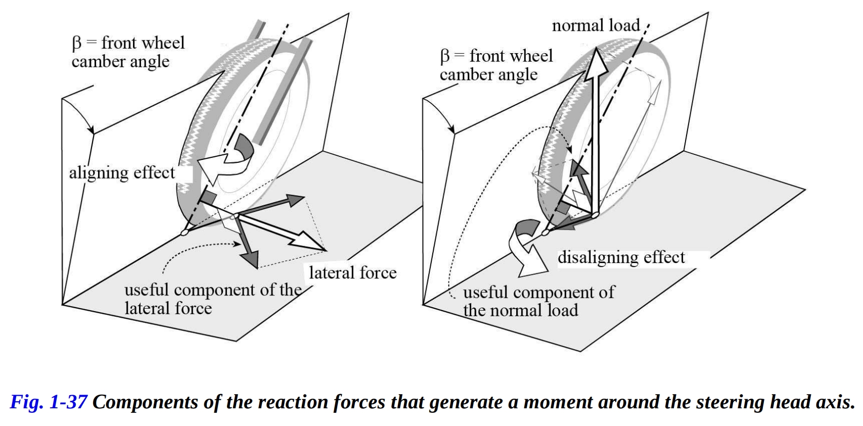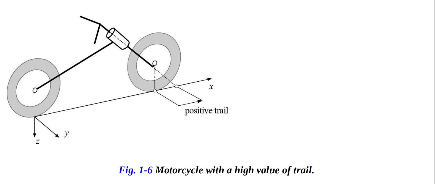 トレイル値が小さいと、横方向の摩擦力の正対モーメントも小さくなります。ライダーが操舵が容易だと感じていても、操舵メカニズムは道路の不均一さに非常に敏感です。トレイルの値が大きい場合(図1-6に示されているような大きなキャスター角でそうなる)、モーターサイクルの直進安定性が増しますが、操縦性は著しく低下します。