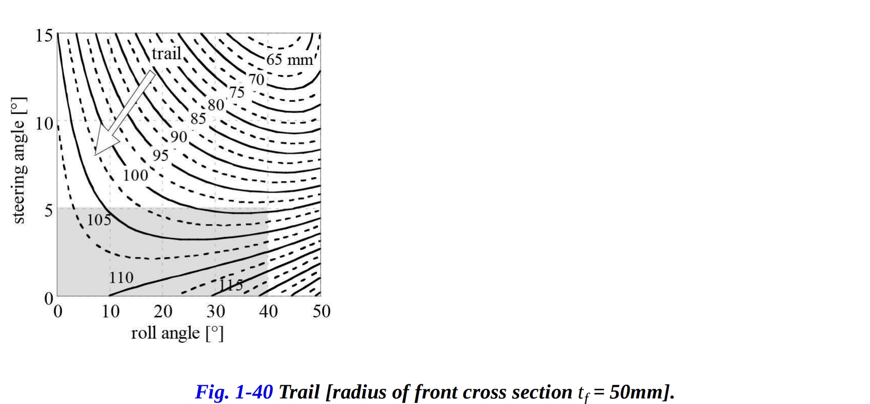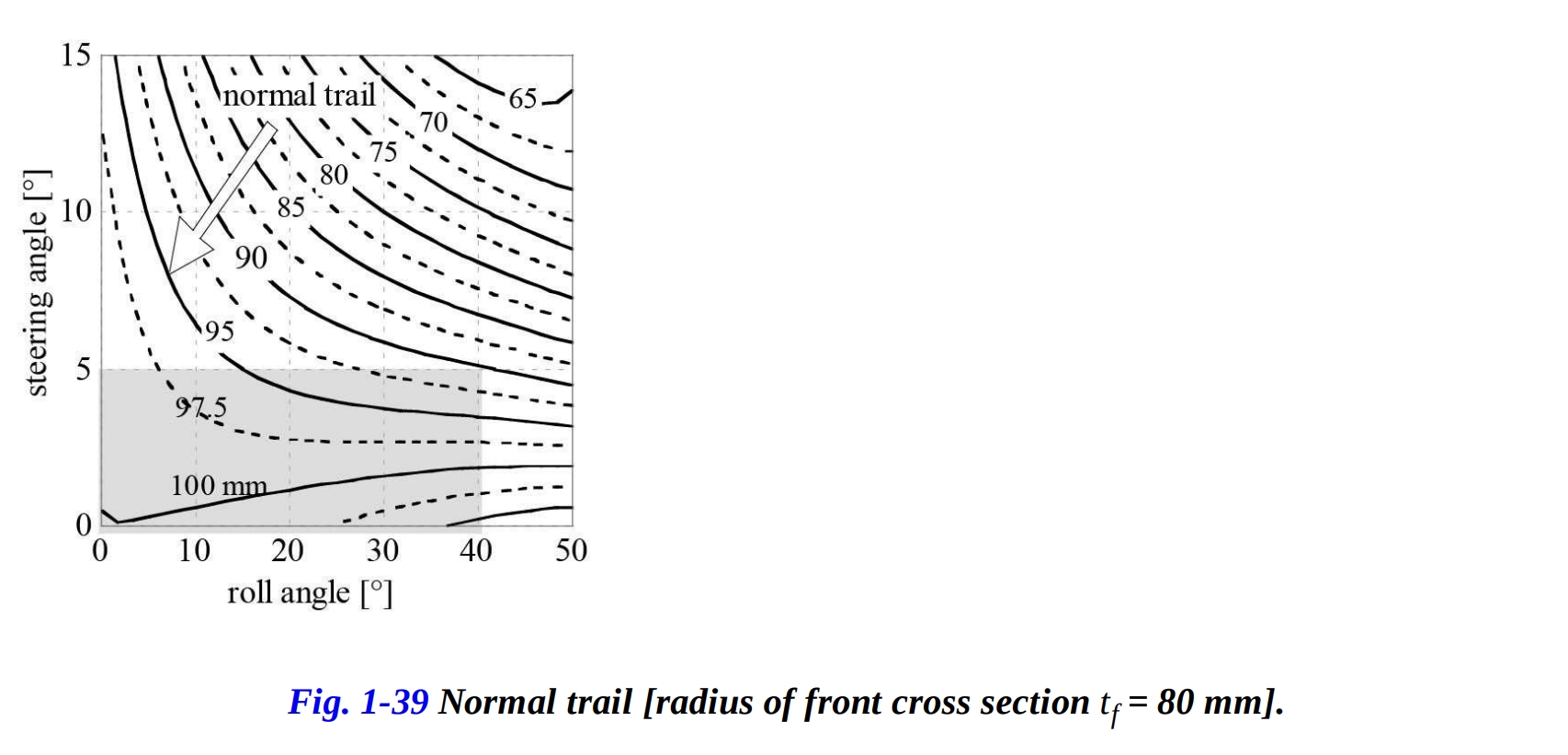 トレイルの値は、モーターサイクルの種類とホイールベースに依存します。競技用モーターサイクルでは75〜90mm、ツーリングやスポーツモデルでは90〜100mm、純粋なツーリングモデルでは120mm以上になります。