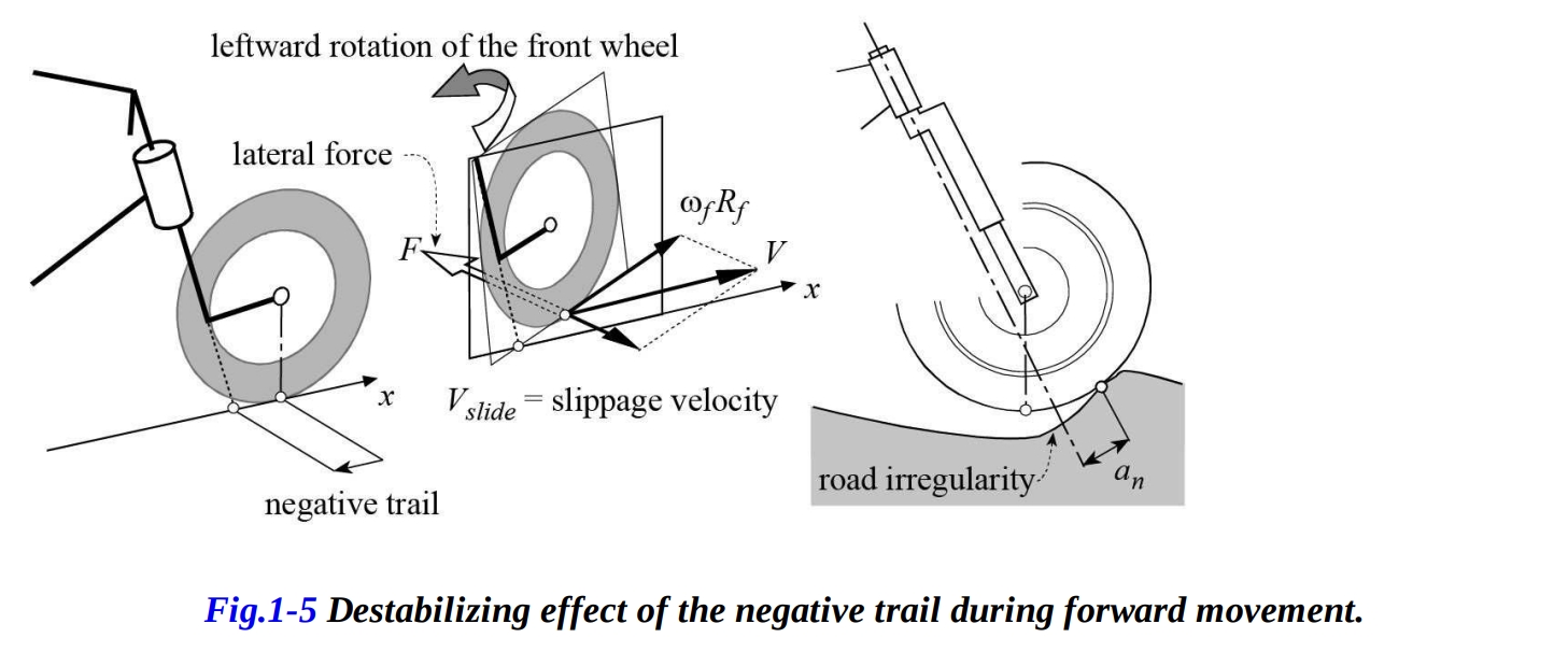もしトレイルの値が負であれば(接触点がステアリングヘッド軸と道路面の交差点の前にある場合)、そして摩擦力 が常に滑り速度の反対方向にあると考えると、左方向への回転を増加させる向きのステアリングヘッド軸周りのモーメントが生成されるでしょう。図1-5では、摩擦力 が乱れを増幅させ、モーターサイクルの平衡が深刻に損なわれることが示されています。図1-5は、道路のプロファイルが、例えばホイールが段差や凸凹を通過するときにトレイルを負にすることがあることを示しています。