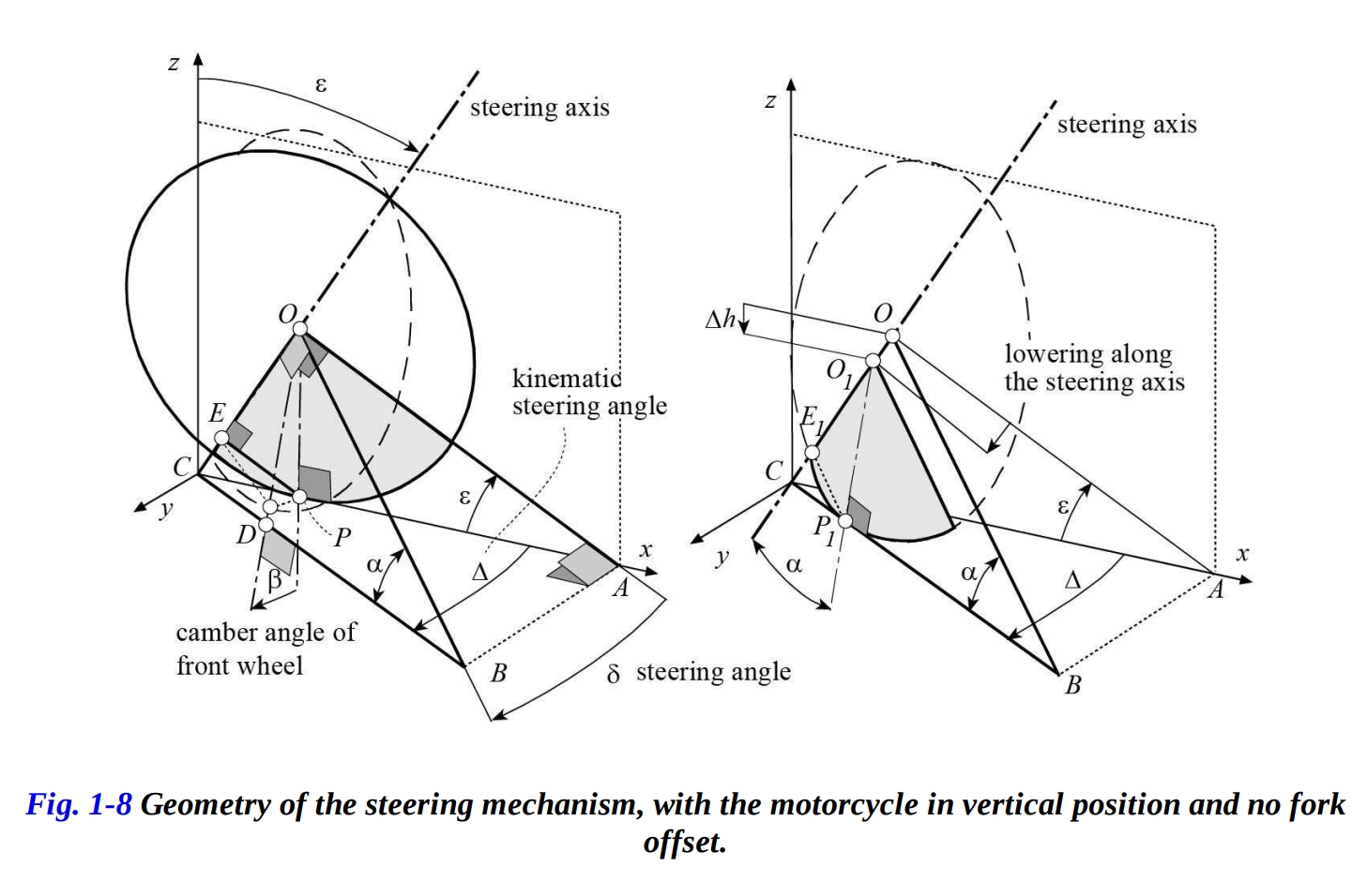 ハンドルを曲げる時に、モーターサイクルを完全に垂直に保っているとすると、ステアリングヘッドは下がり、ステアリング角が非常に高い値の時にのみ上昇を始めます。この現象を以下の場合で説明します。