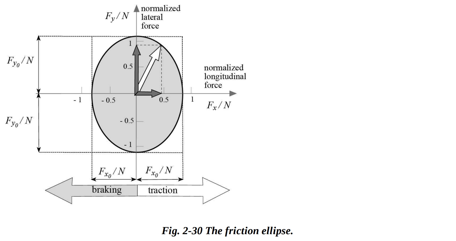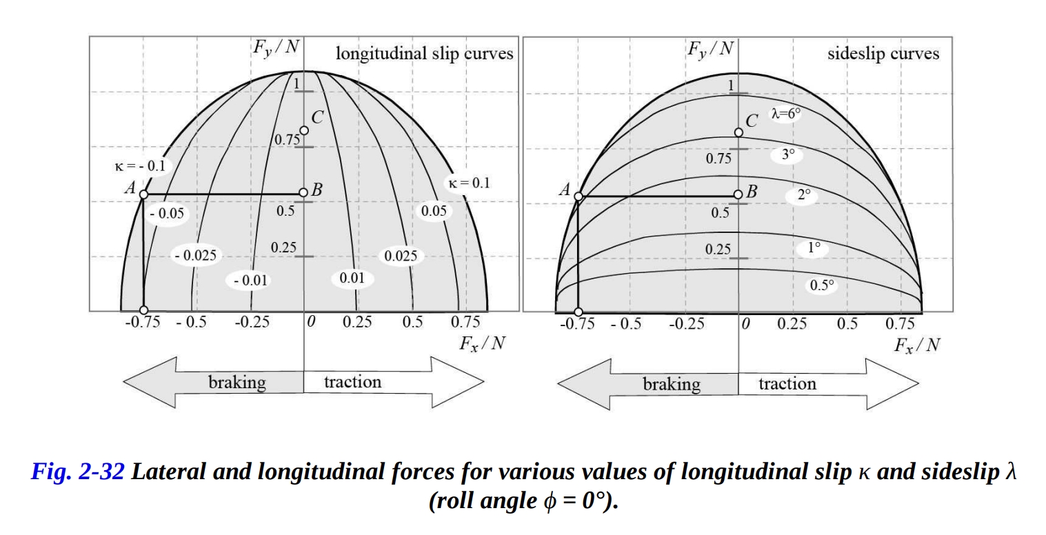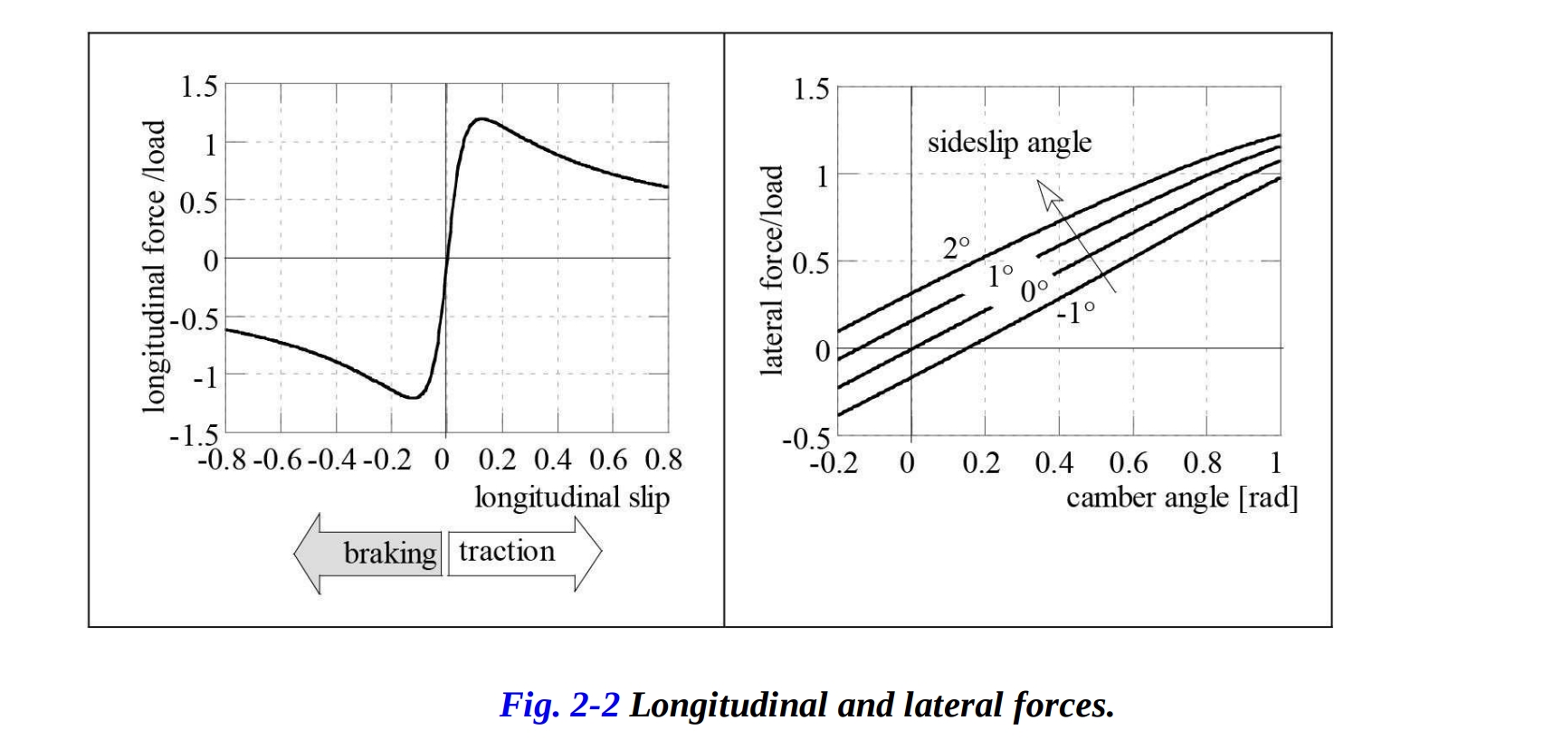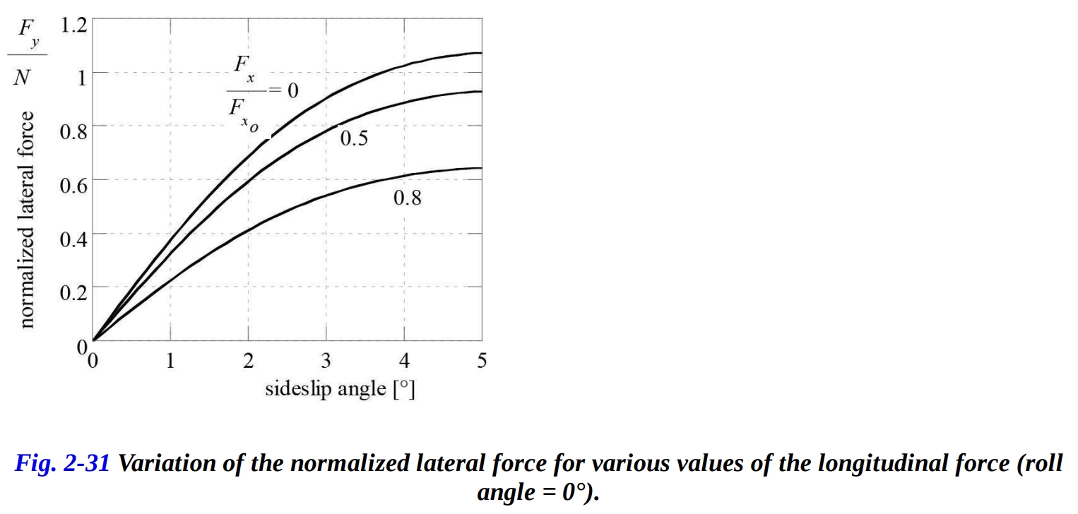 これらの考慮事項は、タイヤが滑りなしで移動すると仮定して定式化されています。ただし、現実には、タイヤの運動は単なる転がりプロセスだけではありません。縦方向力(駆動力およびブレーキング力)および横方向力の発生には、路面状況に応じて、縦方向および横方向のいくらかの滑りが必要です。したがって、自由度の数は7になります。