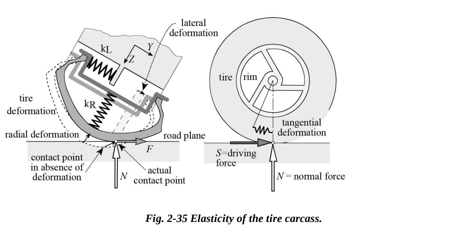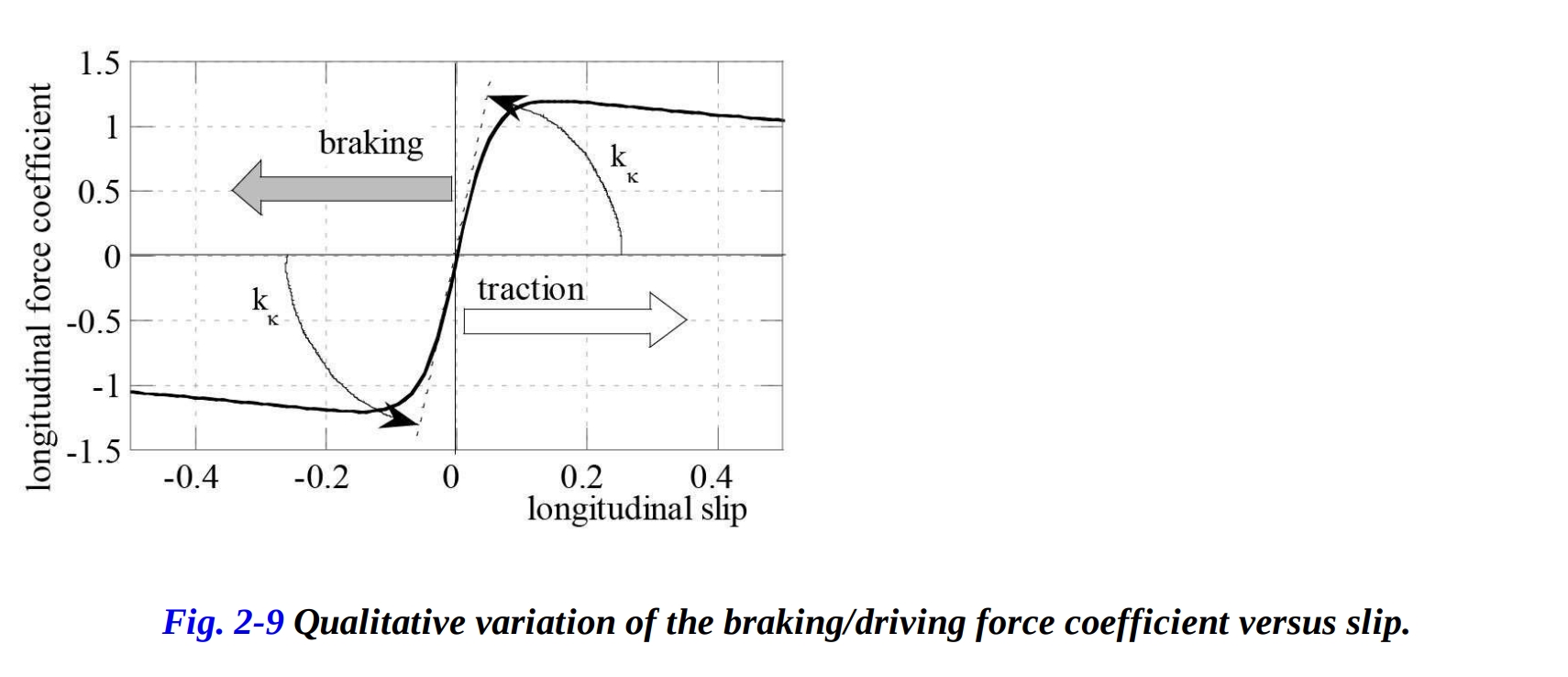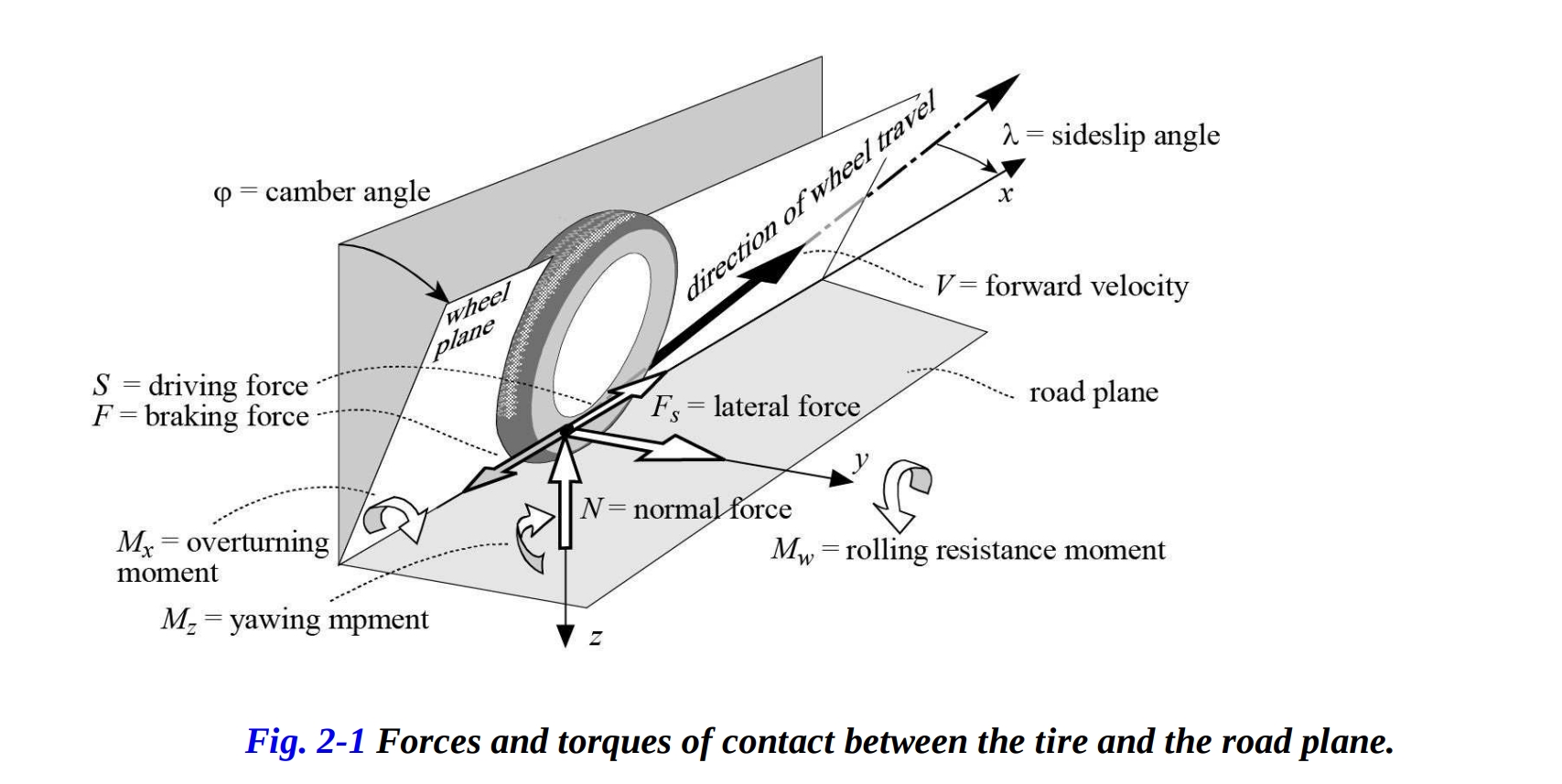 これらの考慮事項は、タイヤが滑りなしで移動すると仮定して定式化されています。ただし、現実には、タイヤの運動は単なる転がりプロセスだけではありません。縦方向力(駆動力およびブレーキング力)および横方向力の発生には、路面状況に応じて、縦方向および横方向のいくらかの滑りが必要です。したがって、自由度の数は7になります。