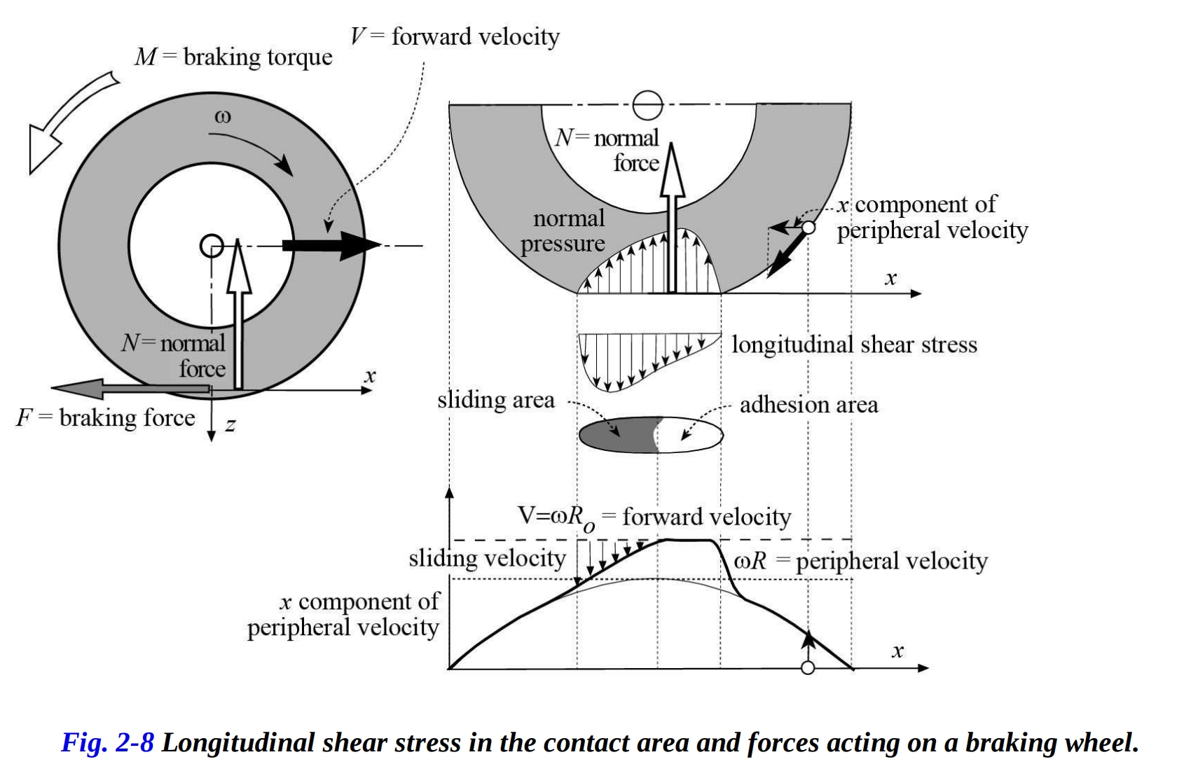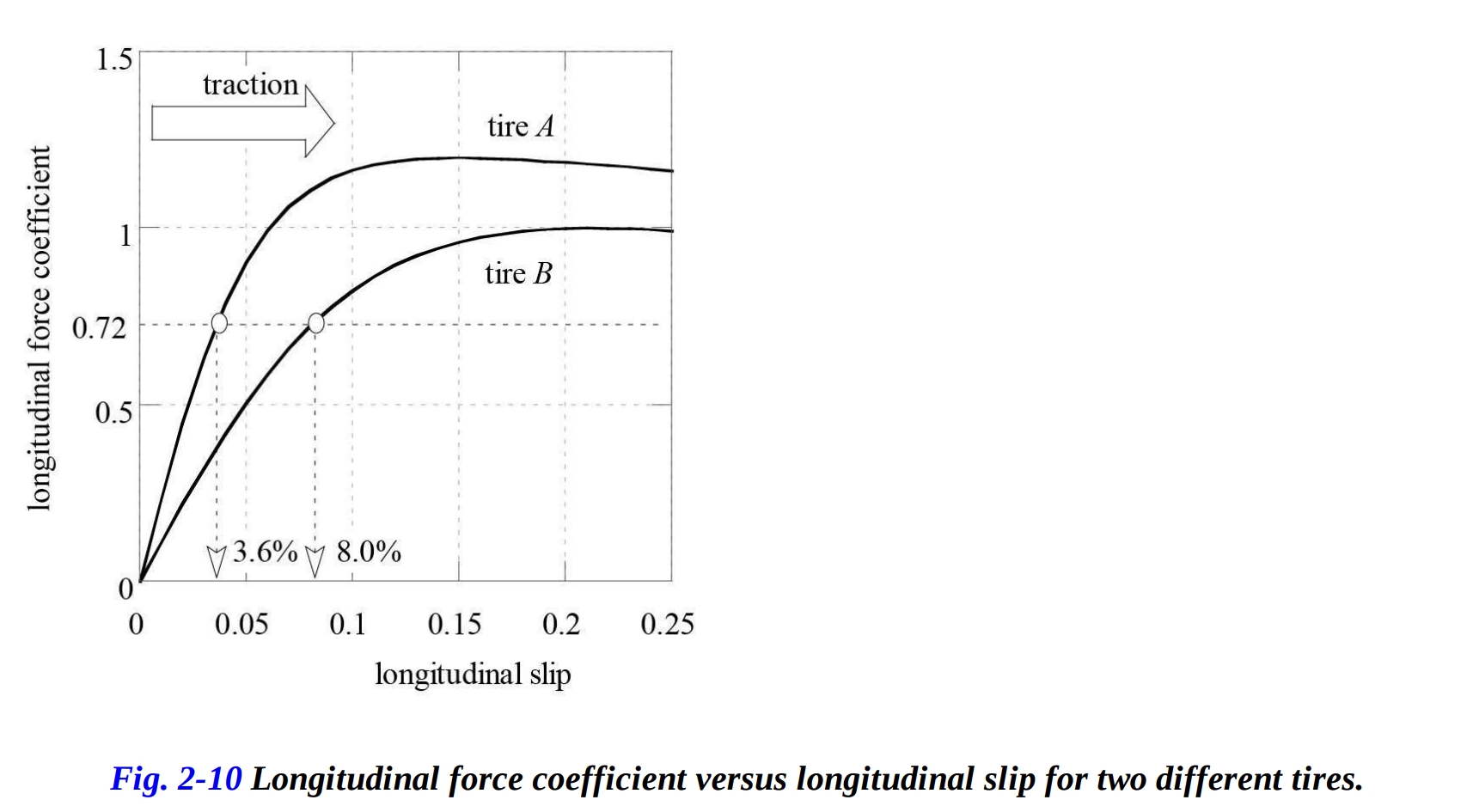 荷重移動 は、全体のブレーキ力および重心の高さに比例し、ホイールベースに反比例することがわかります。ブレーキング中にタイヤの滑りを防ぐためには、そのタイヤに作用するブレーキ力の値が、そのタイヤに作用する動的荷重と局所的なブレーキトラクション係数の積を超えてはなりません。この積は、タイヤに適用可能な最大ブレーキ力、つまり滑りの限界でのブレーキ力を表します。