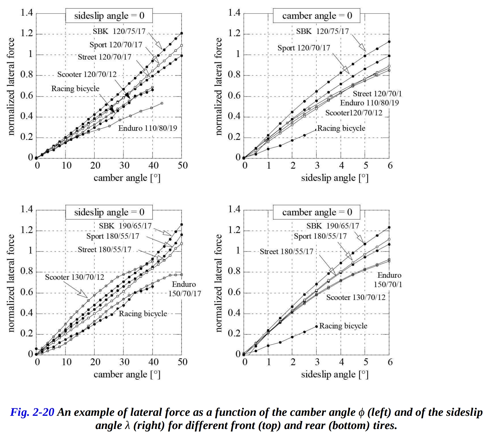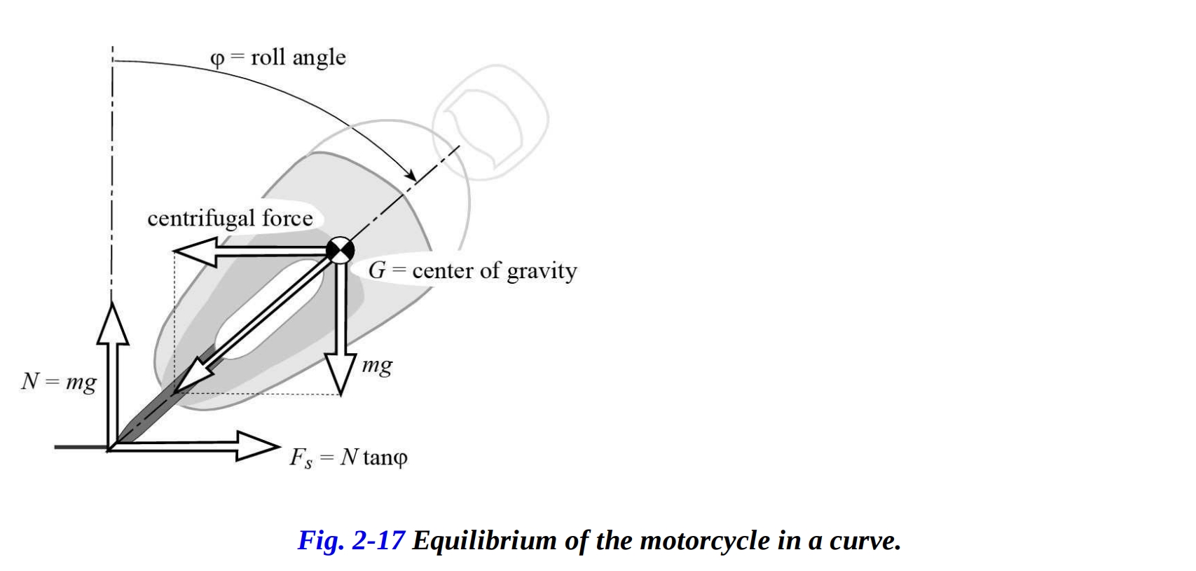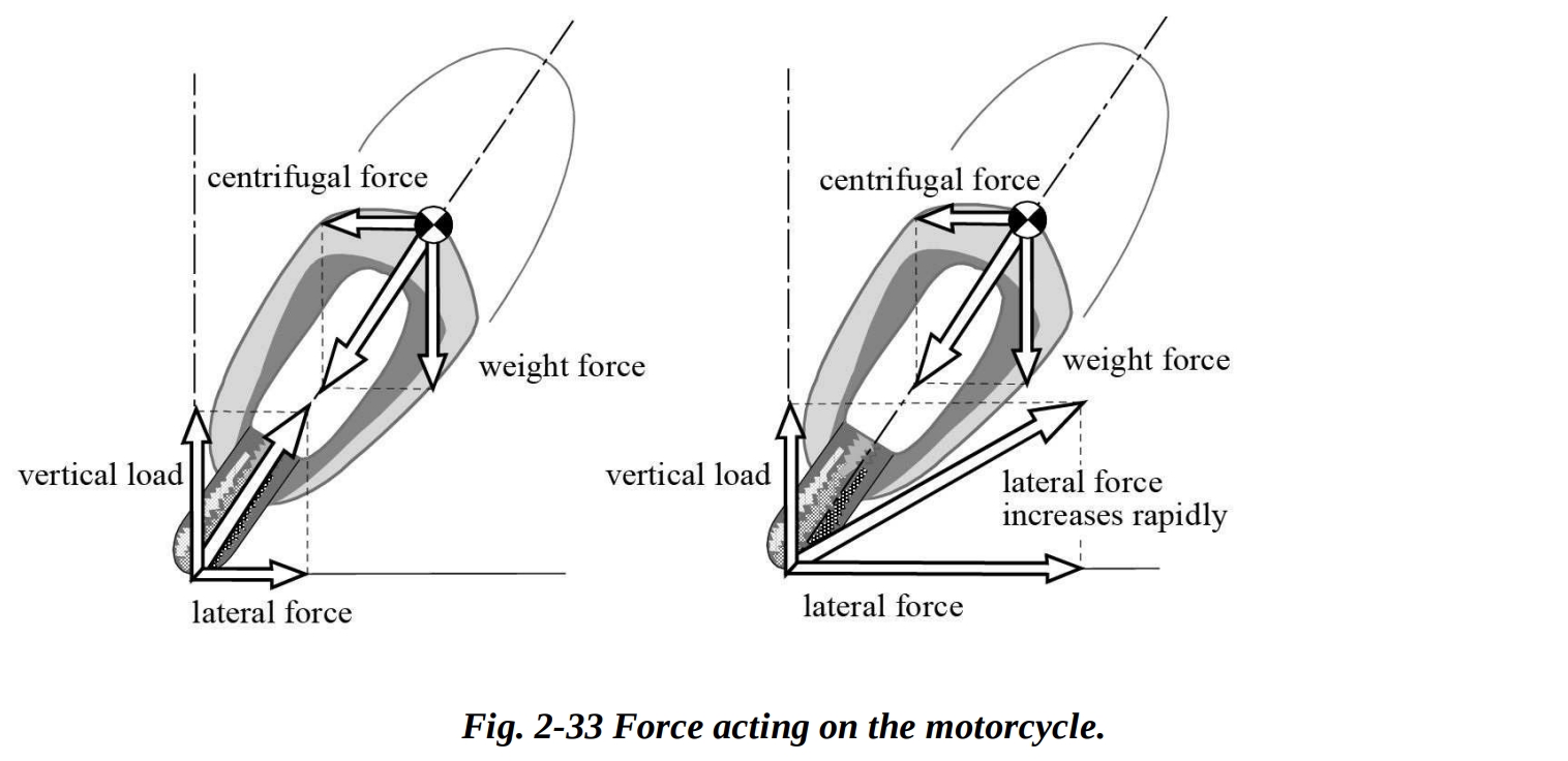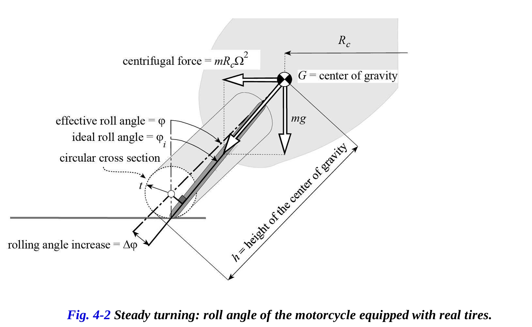 前述の式は、ロール角と断面半径が増加するにつれて、また重心の高さhが減少するにつれて が増加することを示しています。したがって、幅広のタイヤを使用すると、断面が小さいタイヤを装着したバイクに比べて、ライダーはより大きなロール角を必要とします。さらに、タイヤの断面が同じである場合、同じ前進速度で同じカーブを描くためには、重心が低いバイクの方が、重心が高いバイクよりも多く傾ける必要があります。