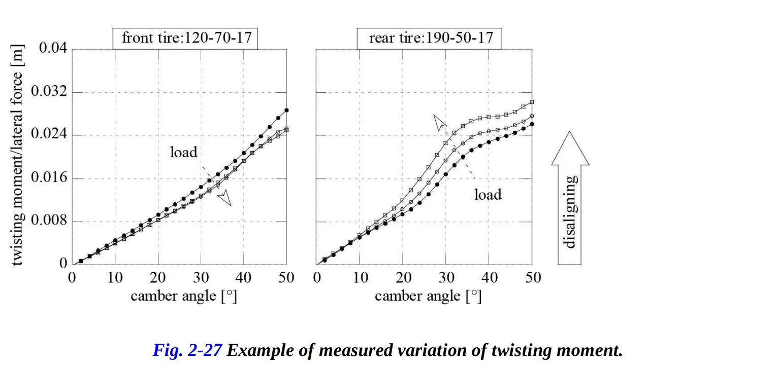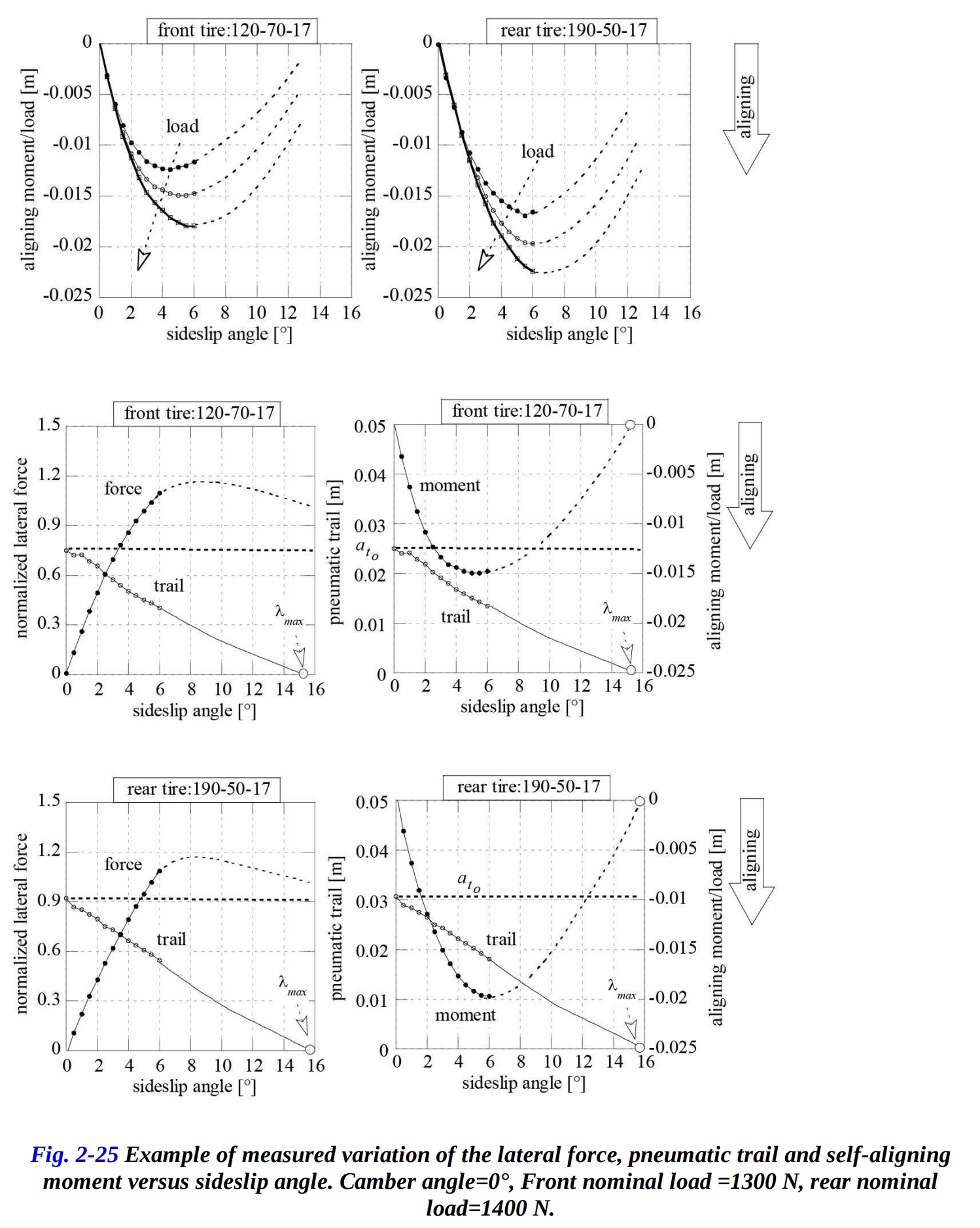 前輪と後輪の横方向の力は、それぞれホイールベースとトレイルに関連する距離 および に比例するモーメントを生成します。これらの距離は次の式によって表されます。