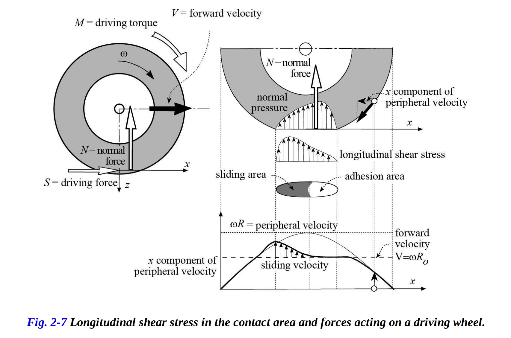 ここで、 は車輪にかかる駆動力を示し、 は抗力を示します。エンジンが十分なパワーを持っていると仮定すると、駆動力は、駆動トラクション係数 と鉛直荷重 の積で与えられる最大力に等しいか、それ以下でなければなりません。