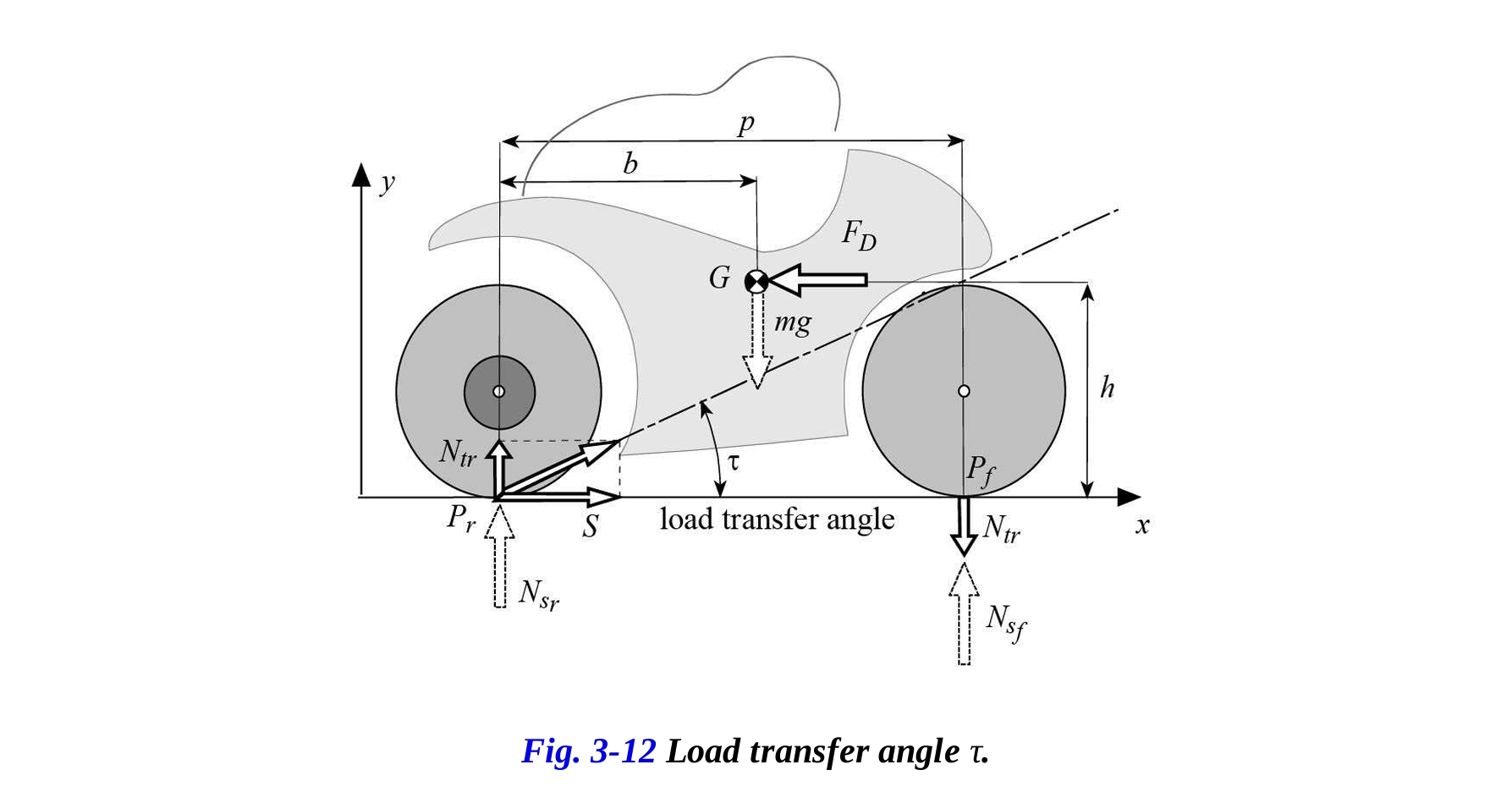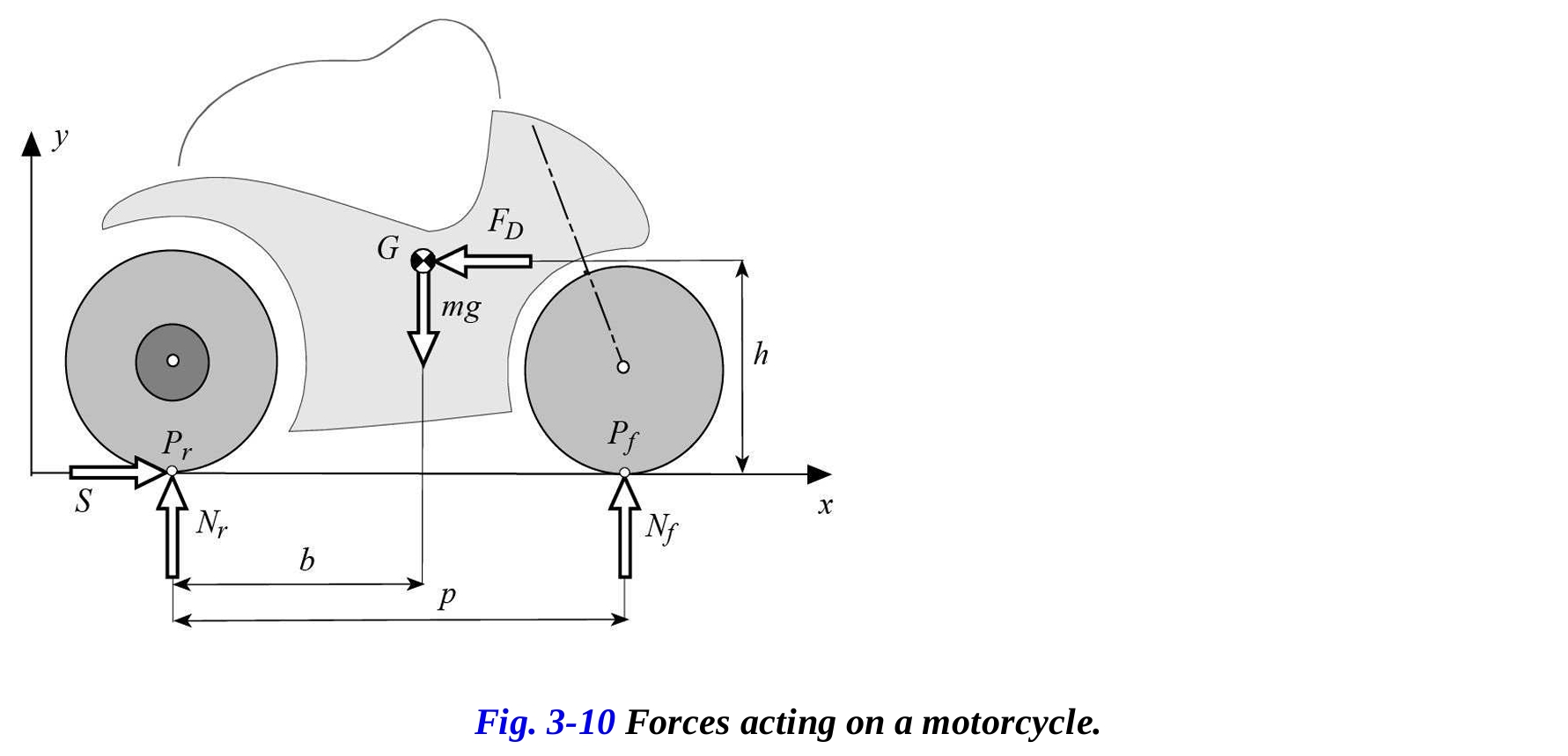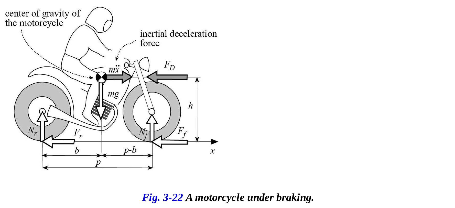 後輪ブレーキの役割を滑り限界で評価するためには、バイクに作用する力に関するいくつかのポイントを考慮する必要があります。減速中は前輪の荷重が増加し、後輪の荷重が減少するため、荷重が後輪から前輪に移動します。ブレーキをかけているバイク(図3-22参照)を考慮し、ニュートンの法則をバイクに適用すると、後輪から前輪への荷重移動を計算することができます。