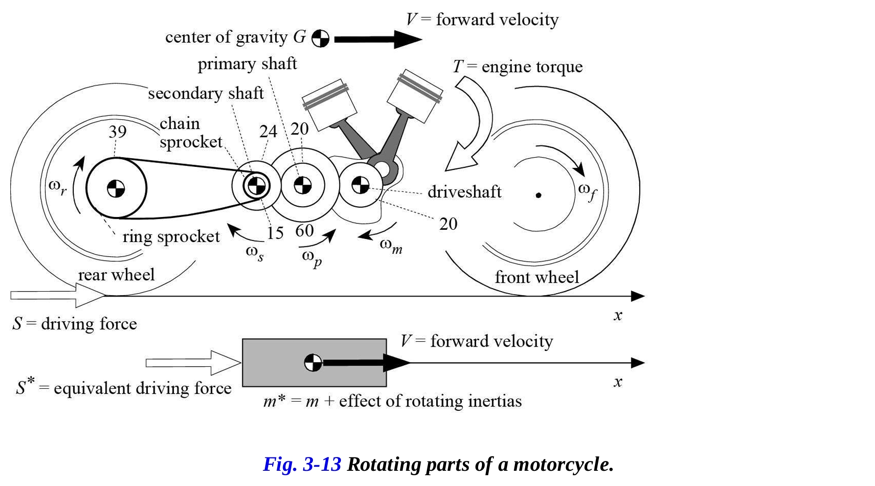 - モーターサイクルの前進運動(リアホイールの回転によって発生する)