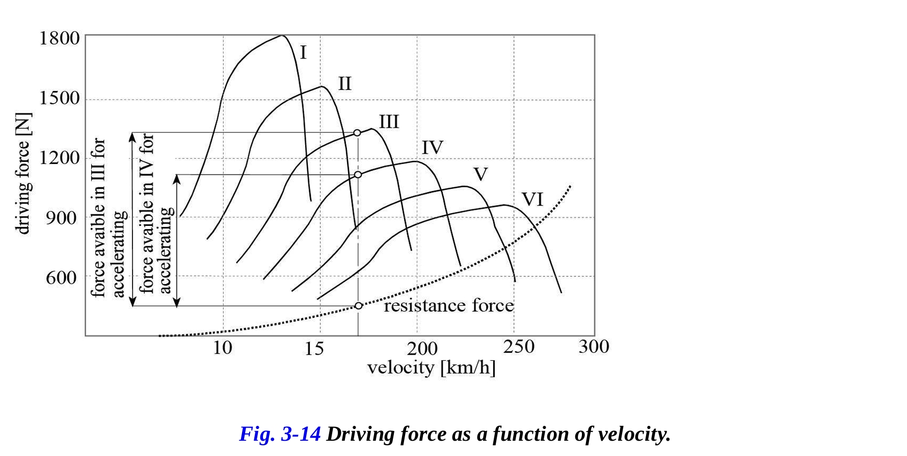 さて、レーシングバイクが図に示された特定の速度で3速ギアで進むと仮定しましょう。その時の駆動力は、そのギアで利用可能な最大駆動力よりも低く、抵抗力よりも大きいため、残りの駆動力を加速や坂道を同じ速度で登るために使用することができます。同じ速度でより高い変速比を考慮すると、加速に使用できる駆動力が少なくなることがわかります。速度が徐々に増加すると、より高い変速比への移行により、利用可能な割り当てが低くなります。最大速度は、最高ギアで抵抗力が駆動力と同じになると明らかにされます。
