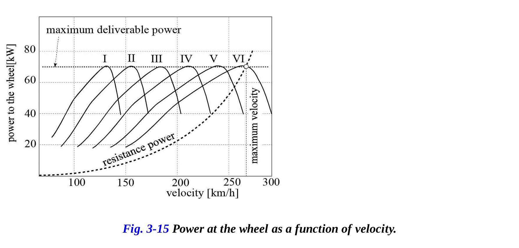 駆動力曲線と抵抗力曲線は、パワーの観点からも比較することができます。各変速比ごとに有効な車輪へのパワーの図を得るために、それぞれの曲線を対応する前進速度で乗算します。図3-15は、車輪への有用なパワー曲線と抵抗パワー曲線を前進速度の観点で示しています。この場合も、抵抗パワー曲線が最高ギアで有用なパワー曲線と交差する点が、到達可能な最大速度を決定します。