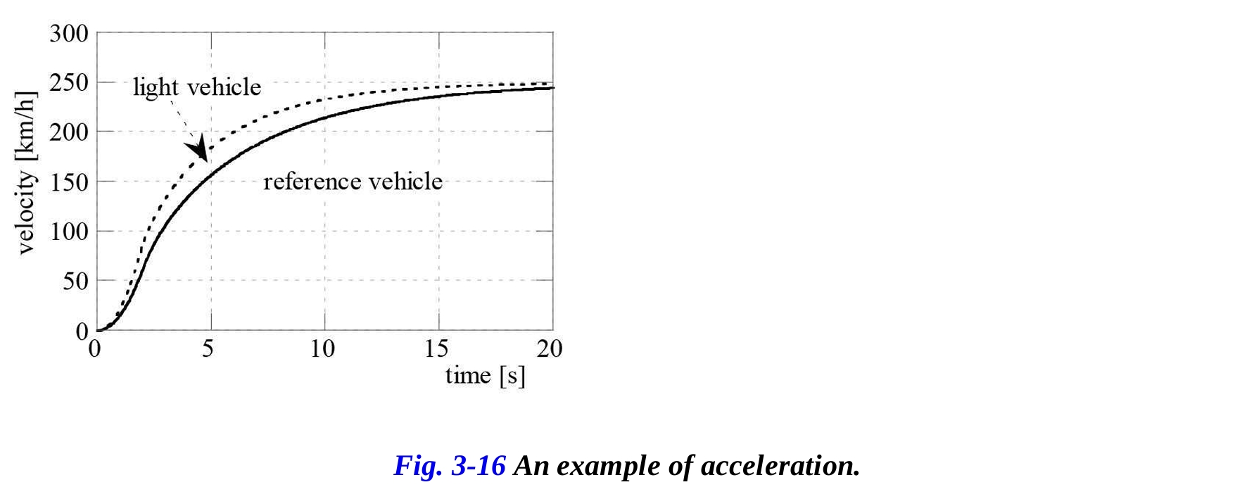 実際の場合、加速度(曲線の勾配)は実際には低くなることがあります。これは、ギアを変えるために必要な時間間隔があり、その間、有効な駆動力がゼロになるからです。さらに、初期段階では、先に述べたように、後輪の滑りや可能なウイーリングのために常に全ての駆動力を適用することができるわけではありません。