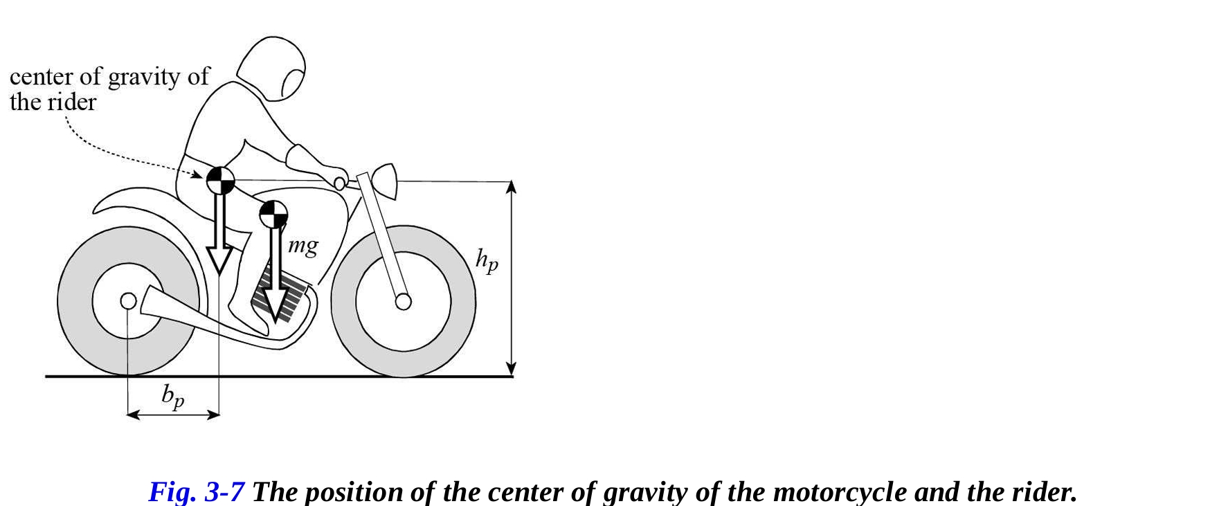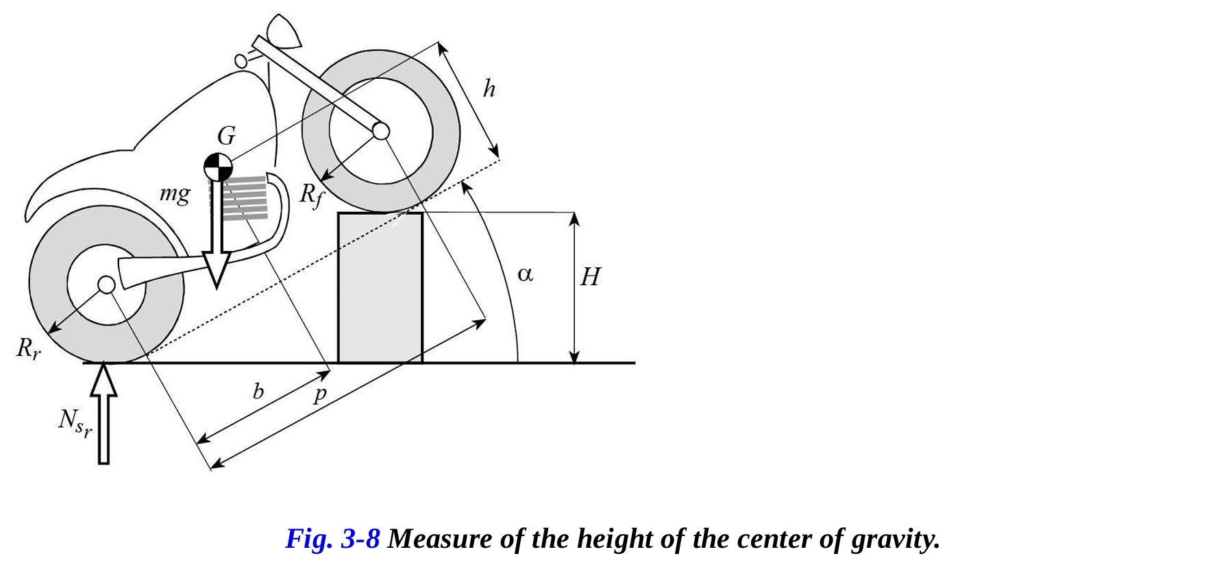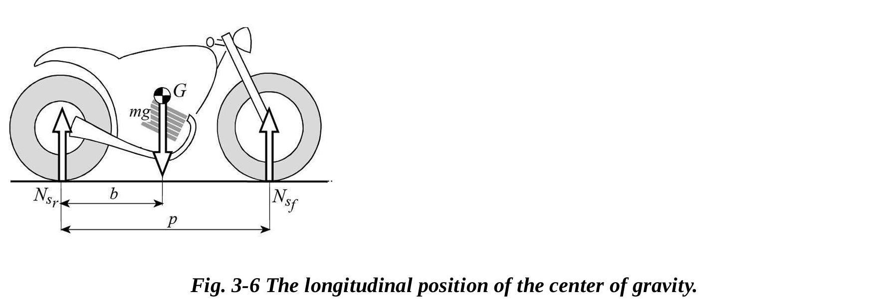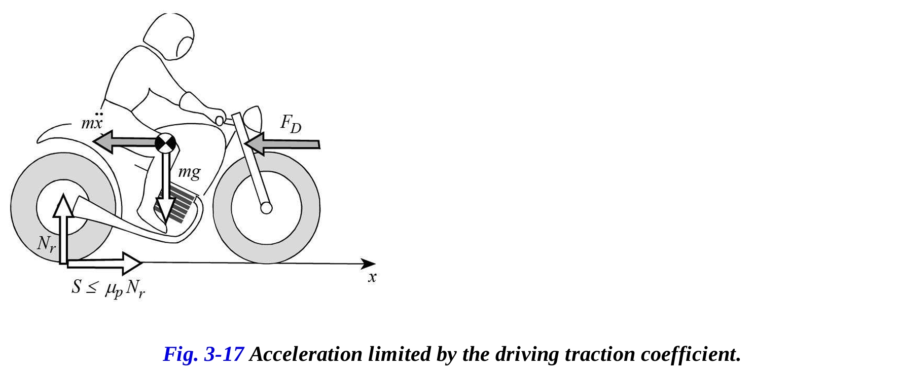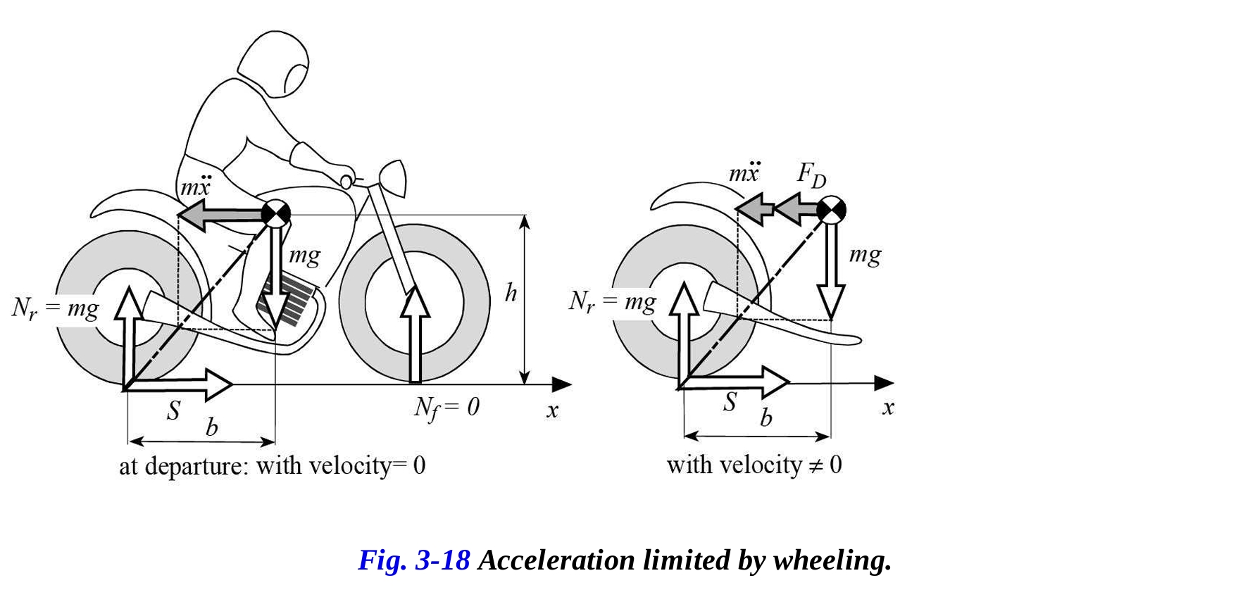 今考慮しているケースでは、図3-19に示されているように、加速度は に等しいです。この値は、バイクに 1835 N の駆動力を適用することで得られます。バイクのエンジンがそのような大きさの有用な力を車輪に供給できない場合、自然にウイーリングは発生しないでしょう(ただし、ライダーが移動やピッチング動作を利用して前輪を持ち上げることは可能です)。
