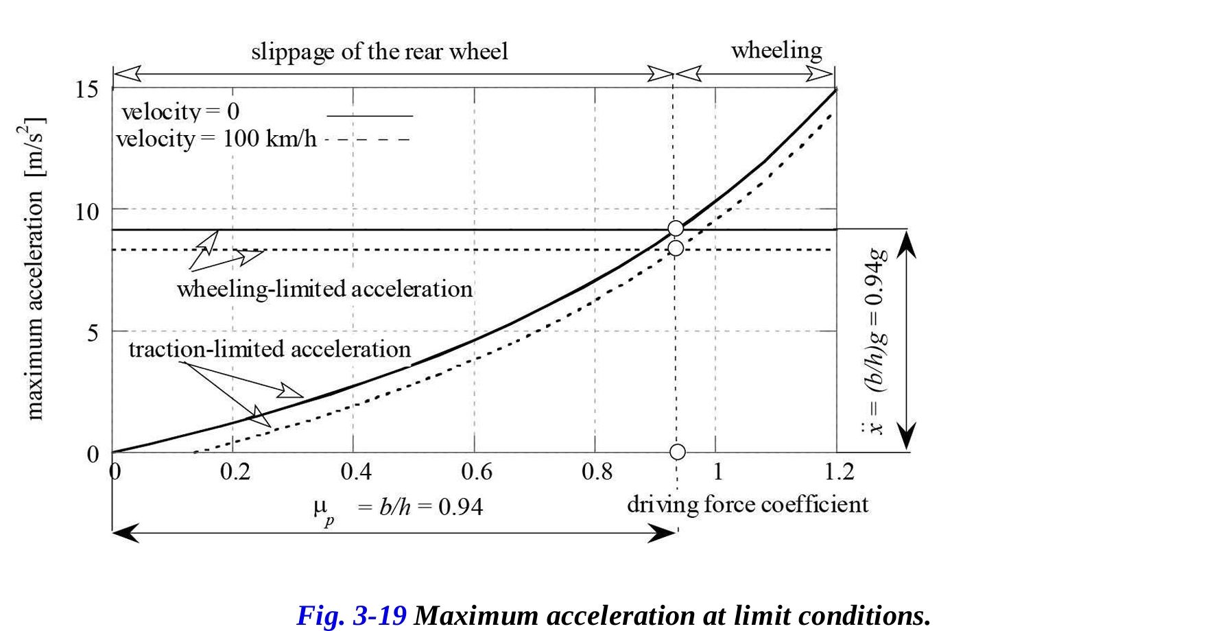 ウイーリングが始まる瞬間の制限条件は、前輪への荷重がゼロに減少するときに達成されます(図3-18参照)。この状況は以下の関係式で表されます。