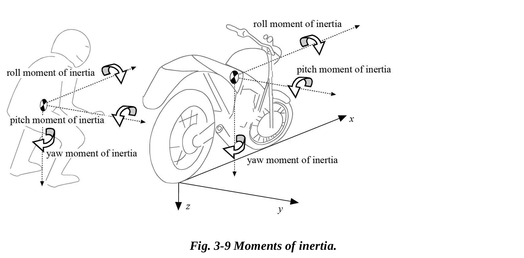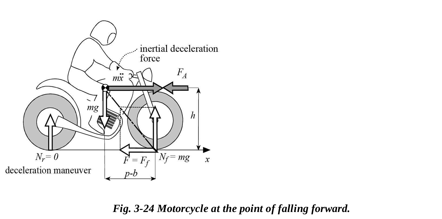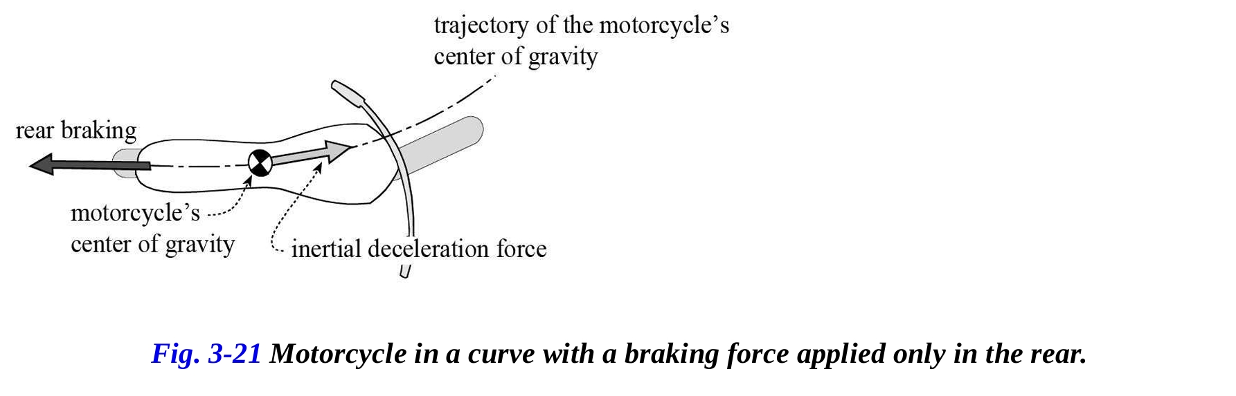 急減速時には、特に荷重移動により後輪の荷重がゼロに近づくと、危険な状態が発生する可能性があります。バイクが完全に直進していない場合、前輪ブレーキの力と減速の慣性力がモーメントを生成し、それがバイクをヨーにする傾向があります。これが図3-20に示されています。