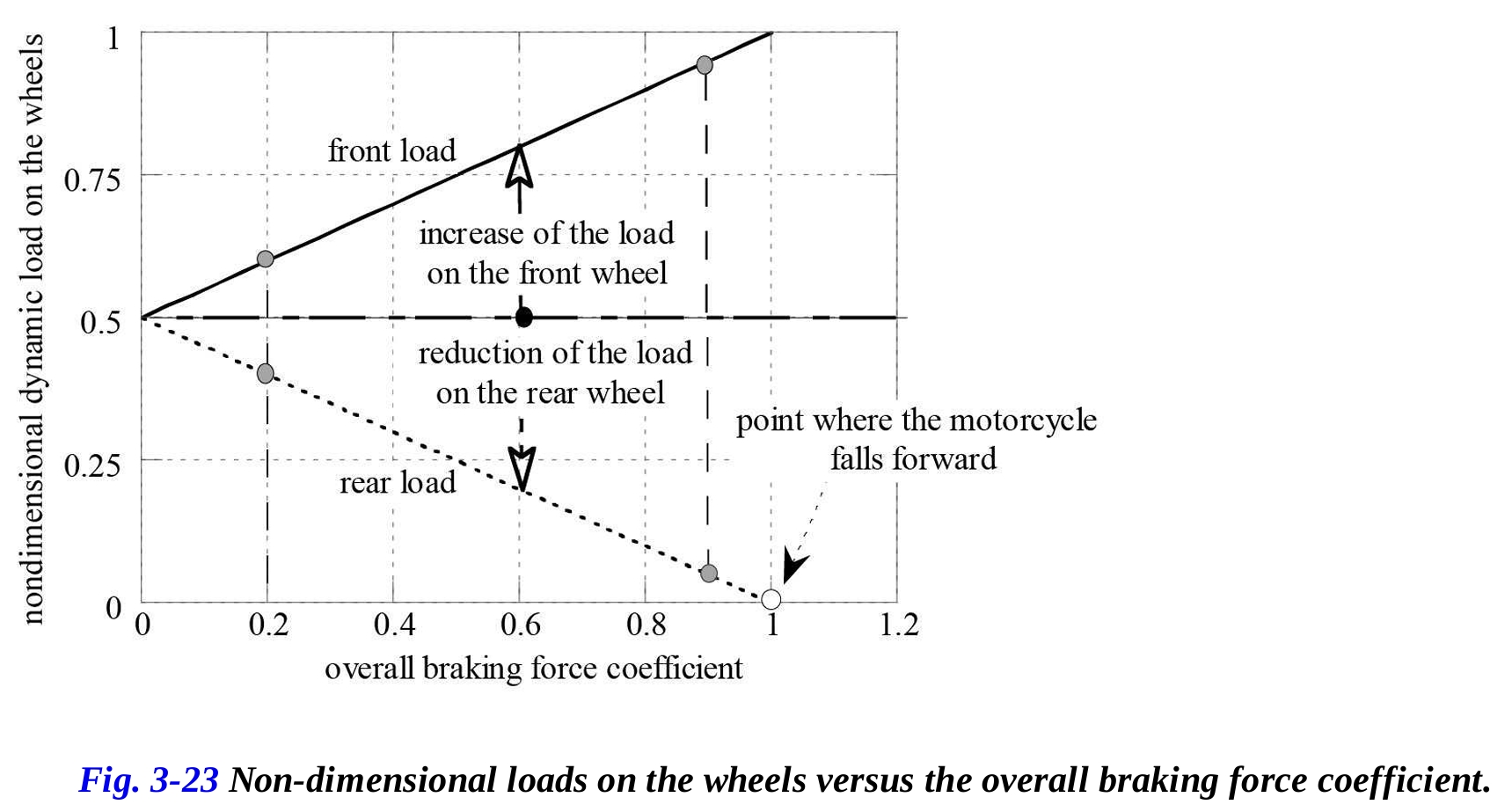 図3.23は、全体のブレーキ力が増加すると、後輪への荷重がゼロになることを示しています。この限界状態は、動的荷重が後輪でゼロになるときにオートバイが前方に転倒することを表しています。