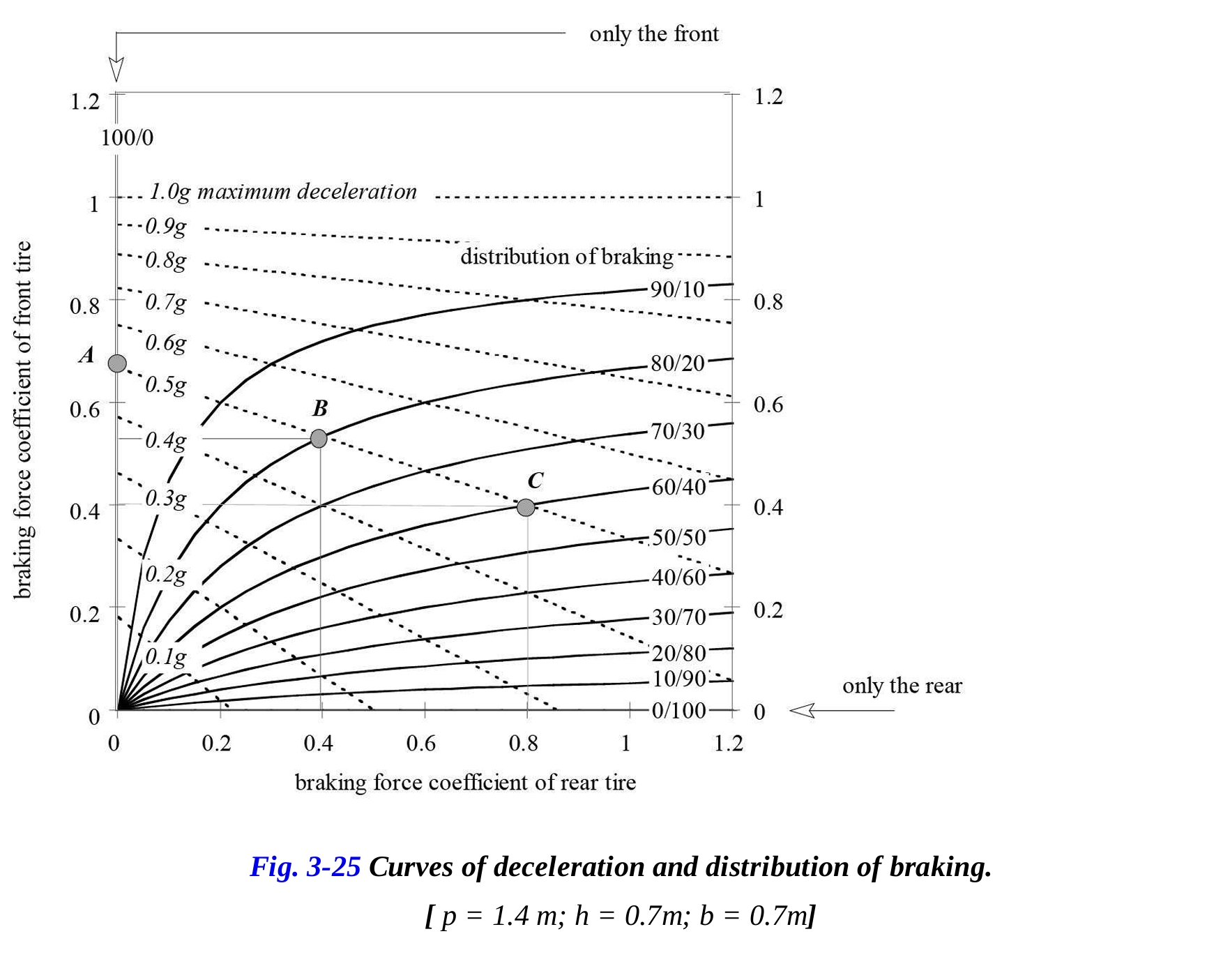 次に、前後タイヤのブレーキトラクション係数が同じであると仮定します。図3-26は、2つのタイヤに同じブレーキ係数を使用することで、最大可能な減速が得られることを示しています。例えば、前後輪ともにブレーキ力係数が0.8の場合、前輪90%、後輪10%のブレーキ分布で最大減速(0.8g)が得られます。この分布で両輪の最大利用が可能となります。図はさらに、前輪のみを使用すると0.67gの減速、後輪のみを使用すると0.29gの減速が得られることを示しています。道路がより滑りやすく、両輪のブレーキトラクション係数が0.4の場合、異なる分布(70/30)で最適なブレーキが行われ、0.4gの減速が得られることが示されています。