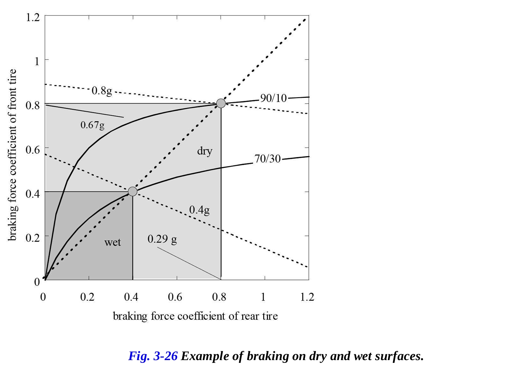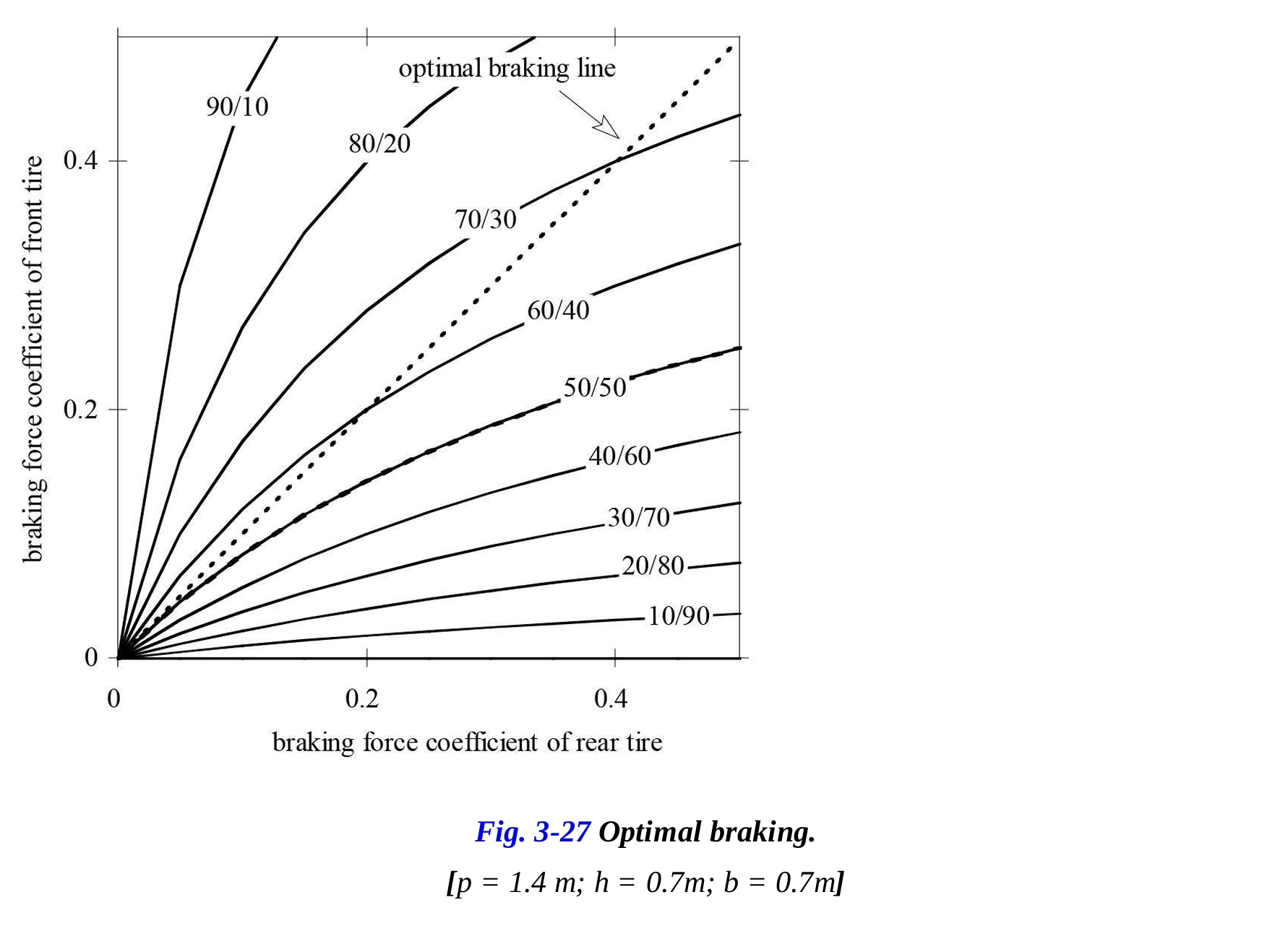 仮に使用されているブレーキング力係数が非常に低い場合、例えば両輪ともにμ = 0.2とすると、グラフから分かるように、車輪への動的荷重は後輪が約0.4、前輪が約0.6となります。これらの条件下では、もしリアブレーキが使用されない場合、最大可能なブレーキング力の40%が使用されません。しかし、ブレーキング力係数が非常に高い場合、例えばμ = 0.9とすると、図3-23に示されるように、前輪への荷重は0.95であり、後輪への荷重はほとんど無視できる0.05です。この場合、リアブレーキ力の可能な貢献はほとんど無視できるほどです。