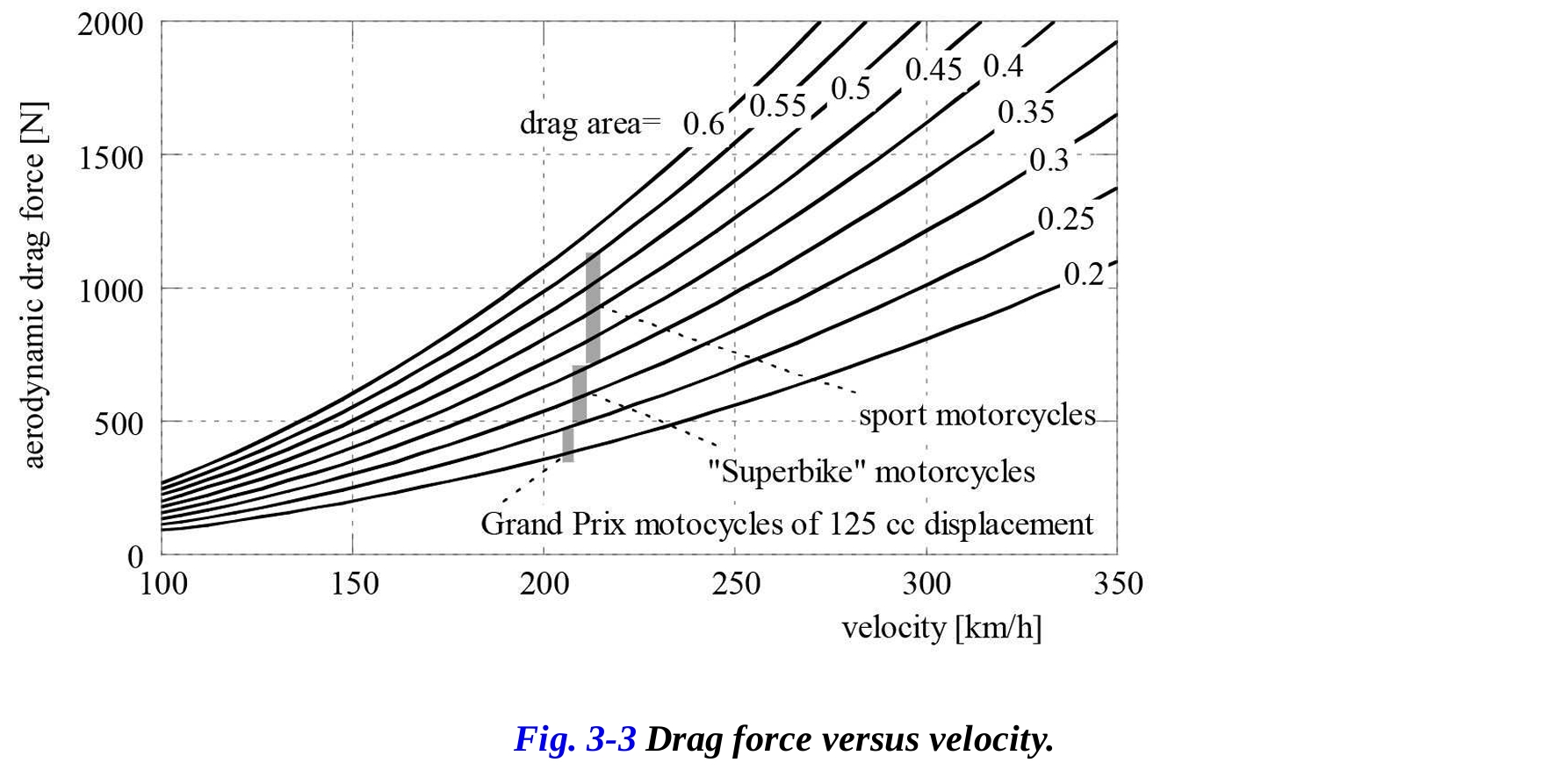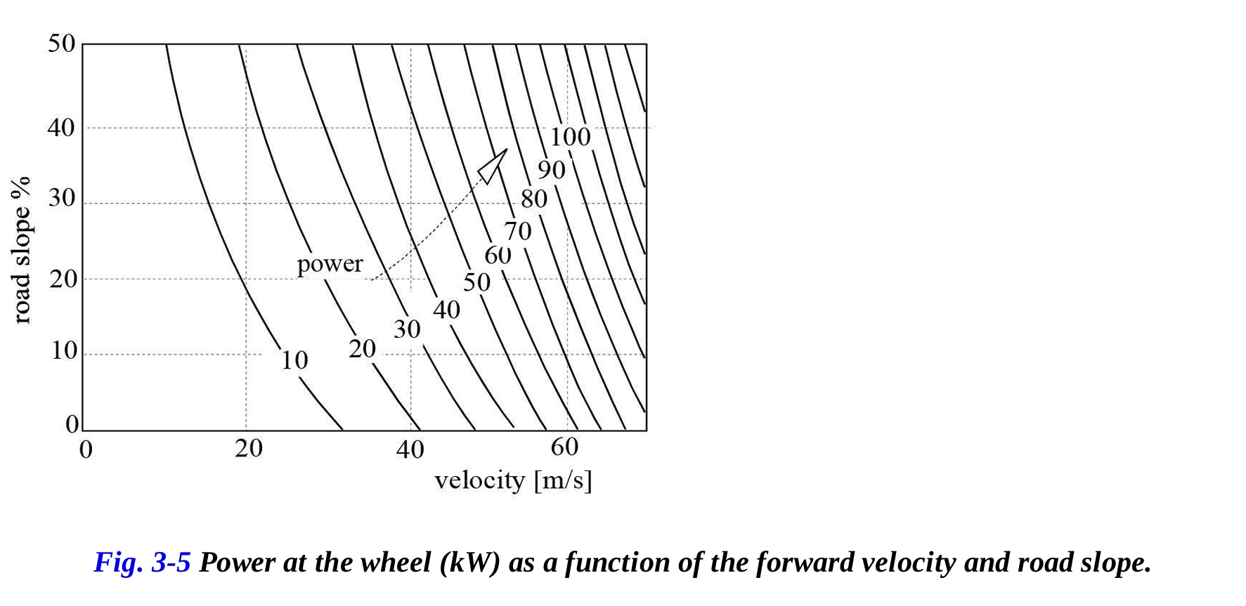 バイクの最大加速度は、後輪の摩擦限界であるときの駆動力係数によって、速度がゼロおよび100 km/hの場合のグラフで示されます(図3-19)。速度が増加するにつれて、最大加速度は減少します。これは、駆動力の一部が抗力力と等しくなり、加速に使用できないためです。