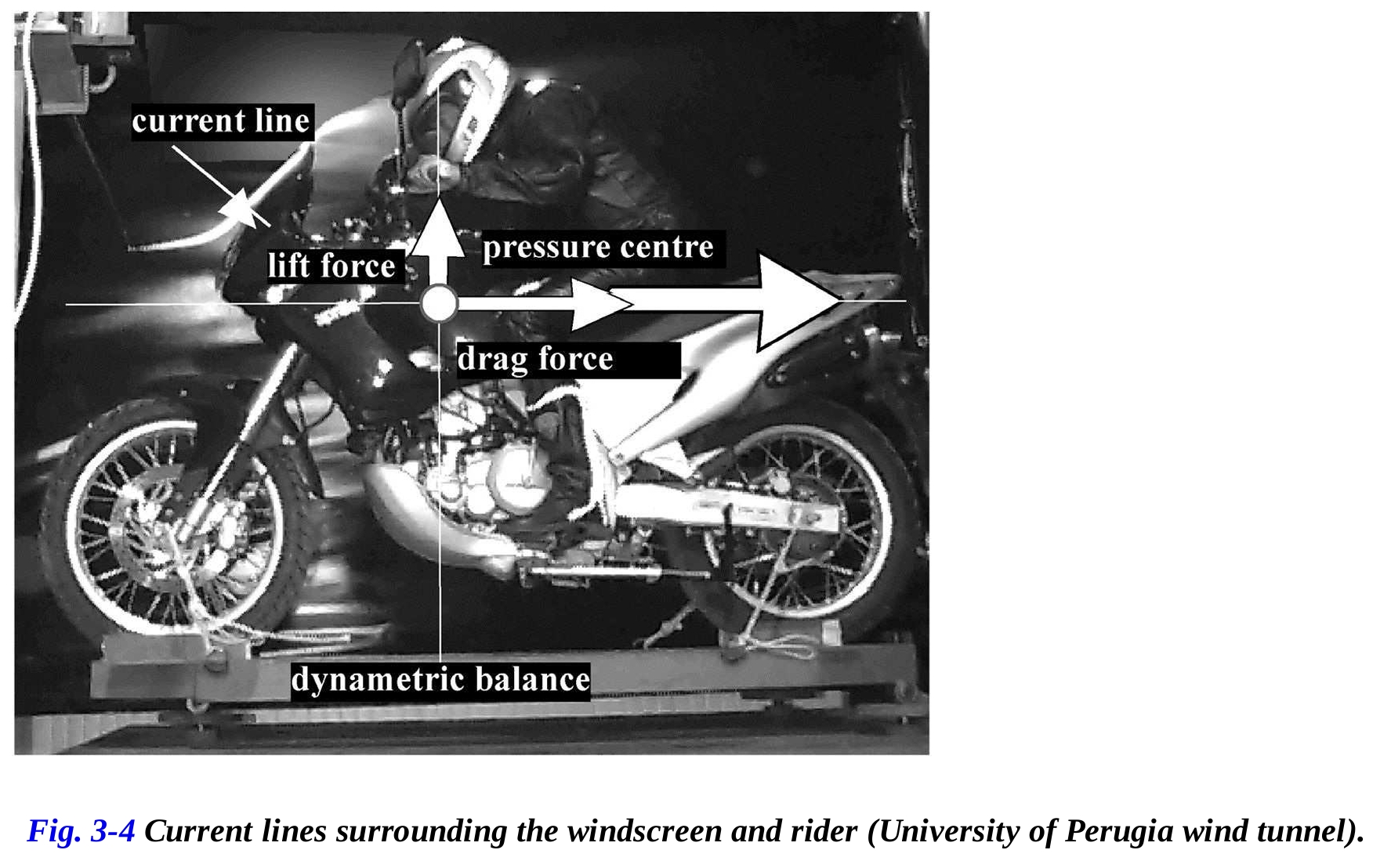 レースでは、ライダーは旋回の内側に体全体を移動させ、バイクのロール角を減少させるとともに、旋回時の車両の制御をより良くします。バイクとライダーのシステムの重心を内側に移動させるためには、足を動かすだけでなく、サドル内で体を動かします(図4-3d)。体を内側に移動させ、特に足を回転させることにより、旋回の進入と通過を容易にする空力的なヨーイングモーメントが生じます。