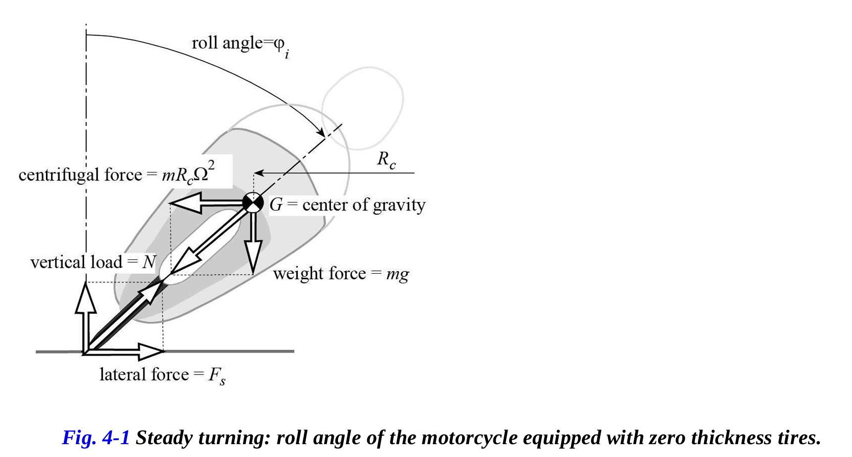 タイヤの厚さが であり、同じヨー角速度 で同じ旋回半径 を描くバイクを考えます。タイヤの厚さがゼロでないため、重力と遠心力によって生じるモーメントの平衡に必要なロール角 は、理想的なもの よりも大きくなります(図4-2)。