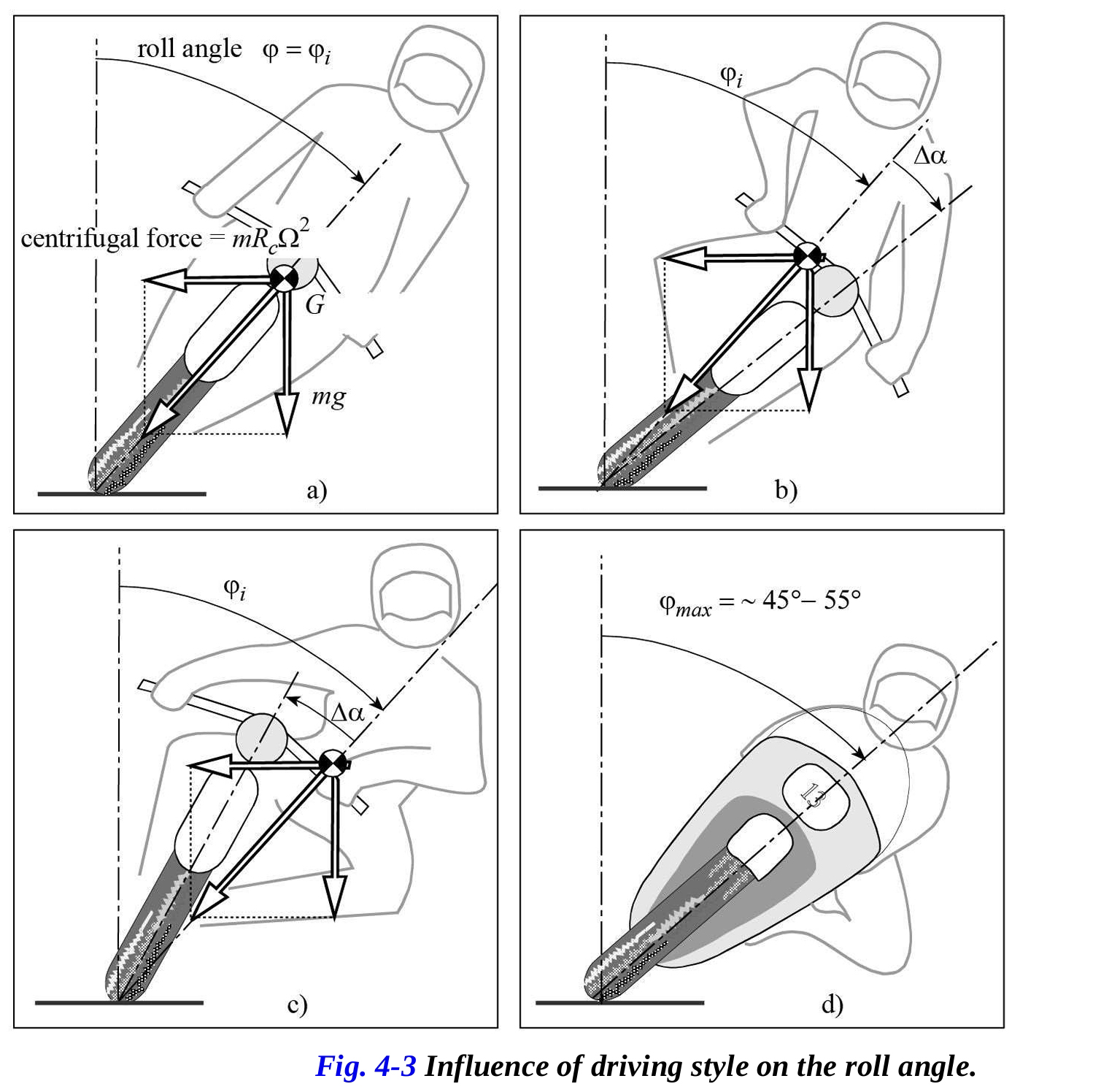 バイクの旋回時のロール角は、ライダーの運転スタイルによって大きく影響を受けます。ライダーがバイクに対して傾くことで、バイクに対する重心の位置が変わります。図4-3は可能な状況を示しています。